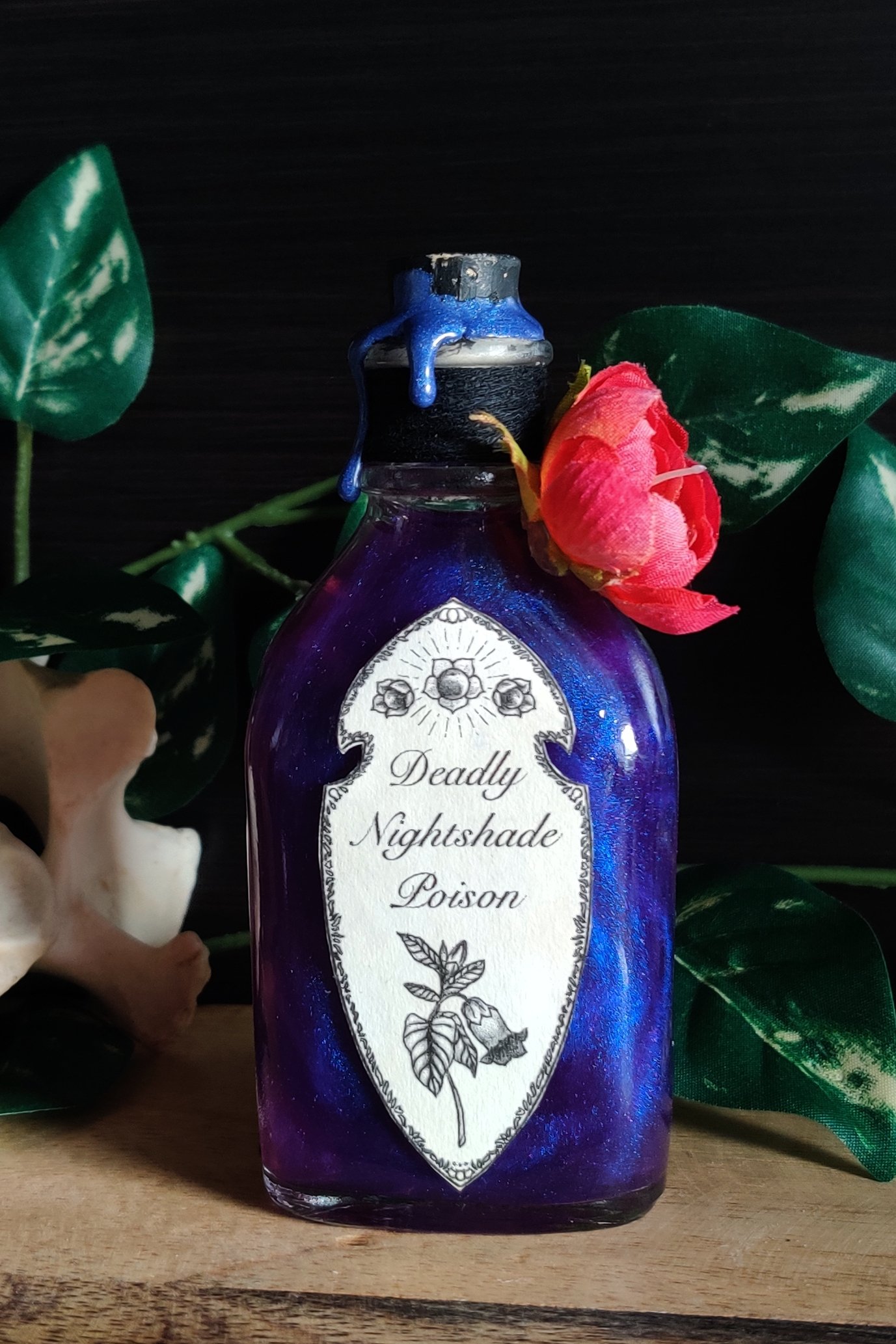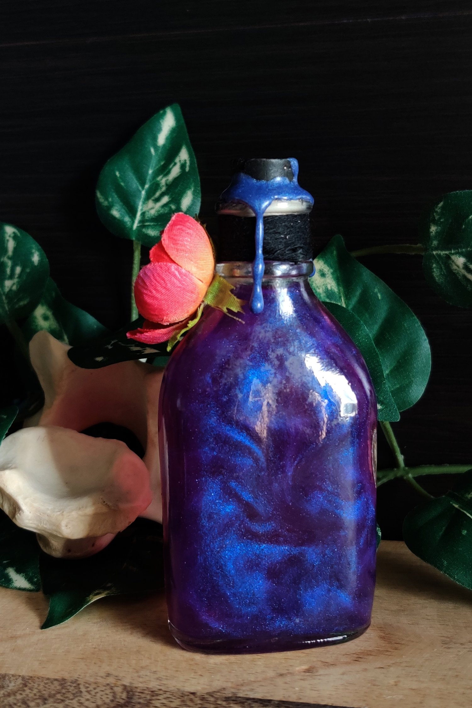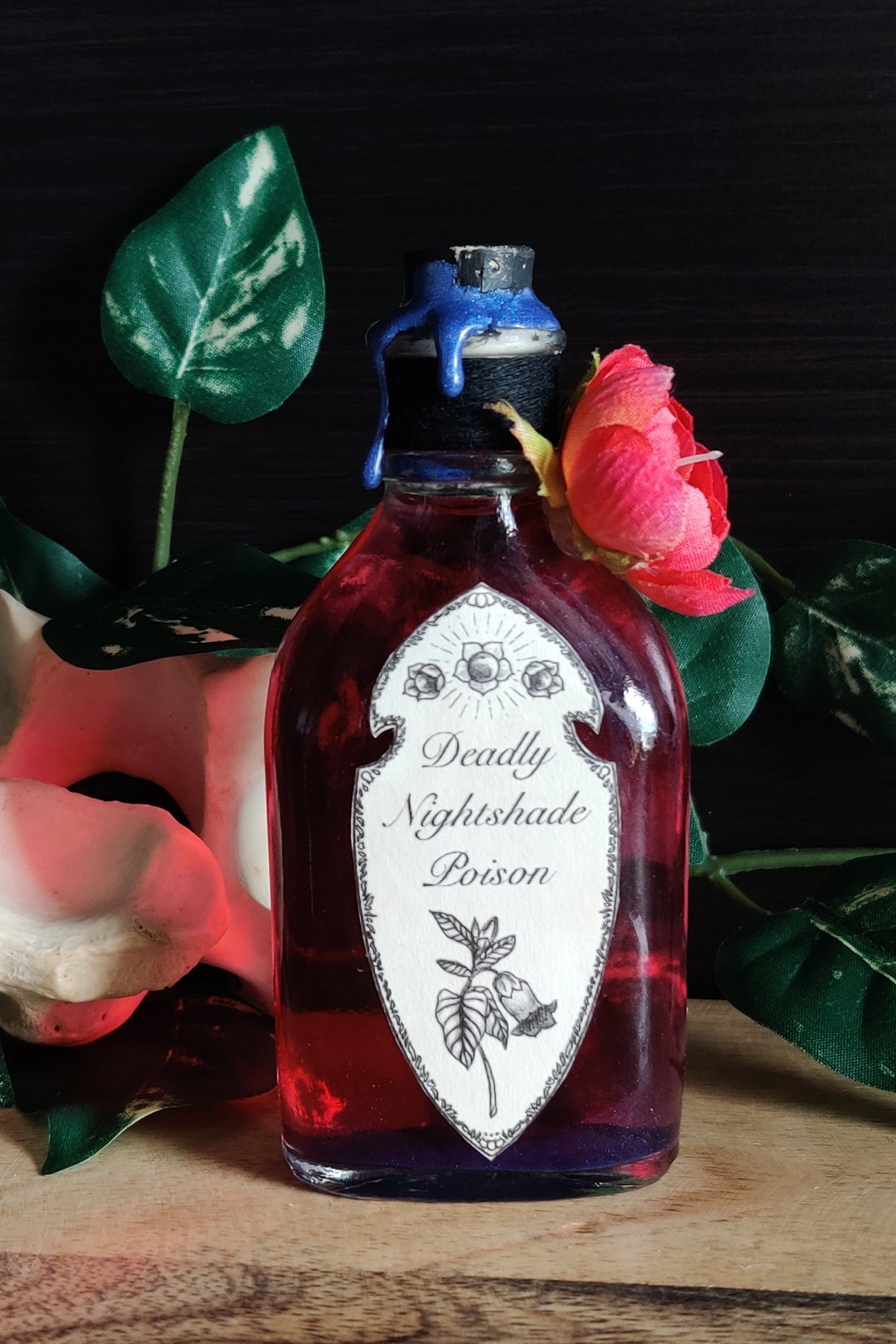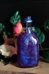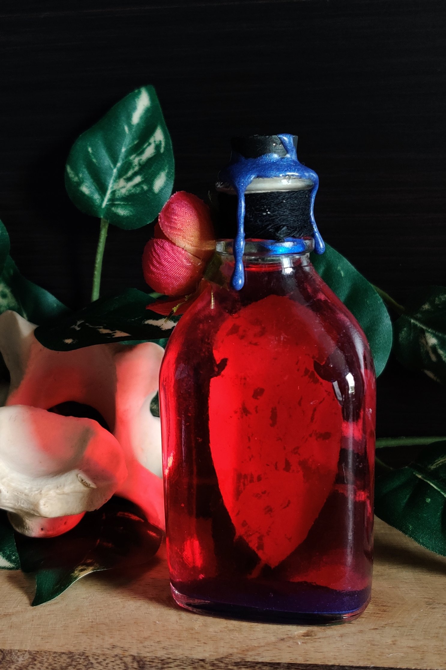 Pullossa on punaista nestettä ja se on koristeltu käsintehdyllä etiketillä, nauhalla ja tekokukalla, sekä sinetillä.