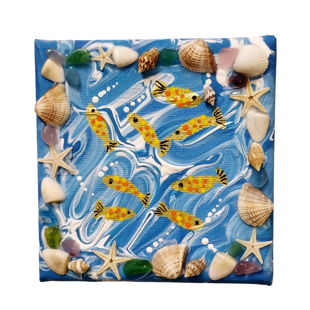 4x4 mini canvas painting of the sea with natural seashells and sand gems. Perfect for shelf decoration and also a fridge magnet!