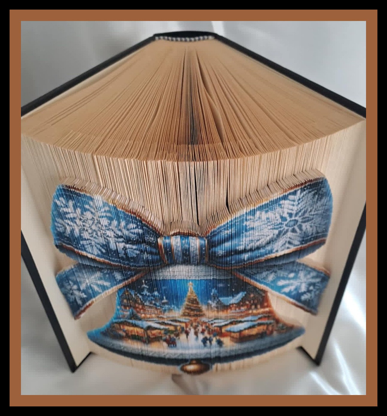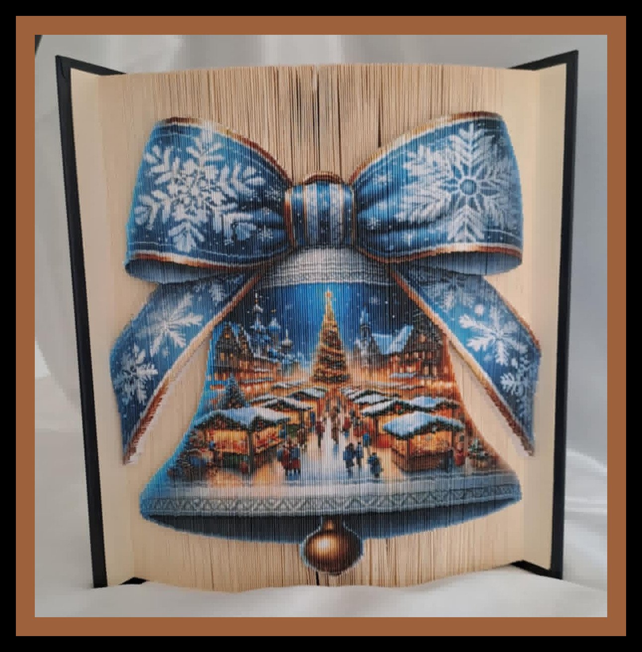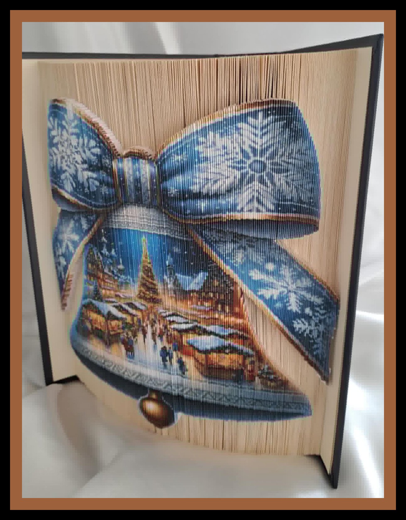 This charming folded book art pattern features a festive Christmas bell beautifully decorated with a large winter bow, revealing a magical seasonal village scene within. The intricate design combines classic holiday symbolism with detailed storytelling elements, creating a warm and nostalgic festive display.