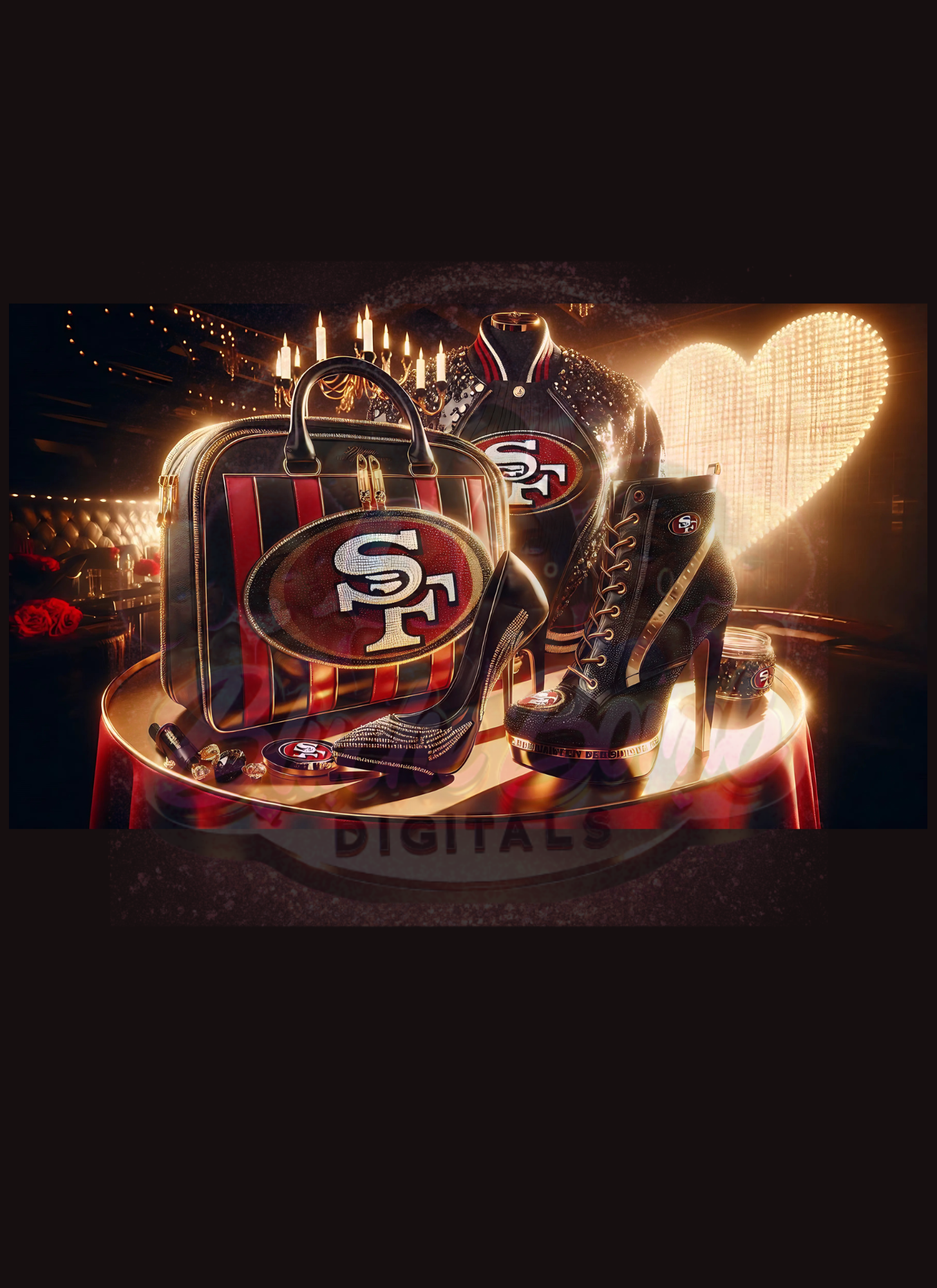 Elevate your game day spirit with this luxurious San Fransico 49ers-inspired fashion and decor digital artwork. This high-quality PNG features an opulent display of Niners-themed fashion items, including a sleek jacket, chic handbag, and stylish boots, all set against a backdrop of golden accents and glowing lights. Perfect for creating standout sublimation prints, digital projects, or unique game-day decor!