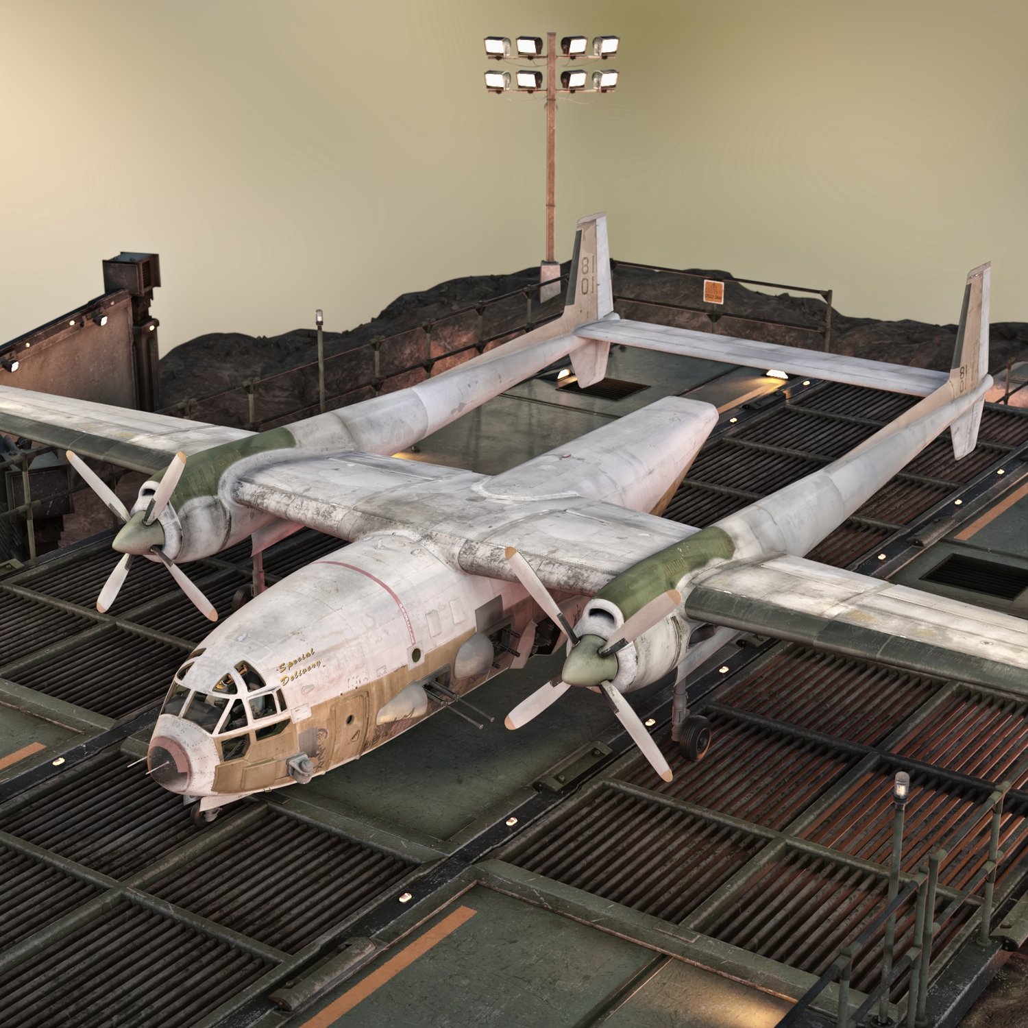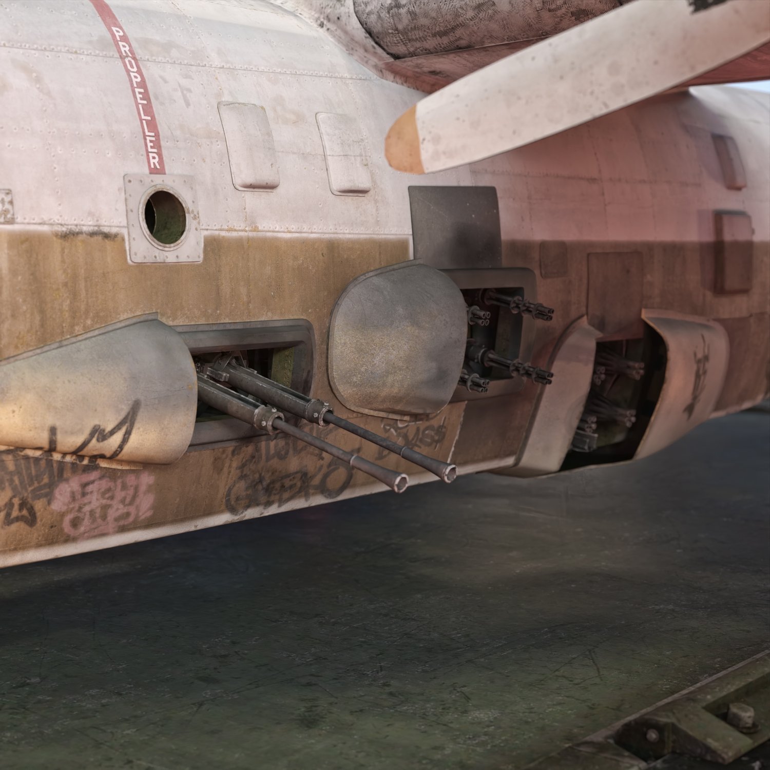 A large plane modified to provide air fire support and cover to ground troops. Old style, probably from the post WW2 era. Used in various battle zones around the world. Rigged and converted for use in DAZ3D. Door, gear, sticks, weapons, bomb etc rigged, for more realistic pictures.