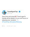 - "Leave the details to me and enjoy a stress-free vacation. Let’s plan your perfect getaway. 🗺️💸 #TravelAgent #RelaxAndTravel"
