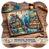 Whimsical vintage junk journal background featuring a cozy mushroom house and glowing lantern cluster, designed in a richly textured watercolor and ink style.