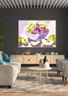 It is a still-life capturing the liveliness of fruits done through a watercolor-inspired style. At the center of the composition is a lavender bowl filled with slices of green apples and grapes. Surrounding the bowl are red and green apples. The watercolor rendering made the enticement of tasting the sweetness feel very real. This is more than just a still-life rendition, but a portrait of nature’s precious gifts.