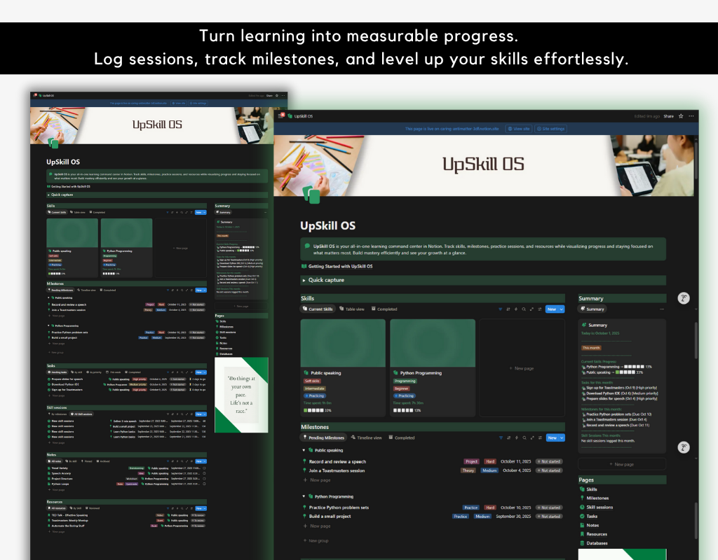 UpSkill OS is your ultimate learning command center in Notion — designed to help you master skills faster, stay organized, and visualize progress effortlessly. Whether you’re learning programming, public speaking, or any personal or professional skill, this all-in-one system gives you complete control over your growth journey.