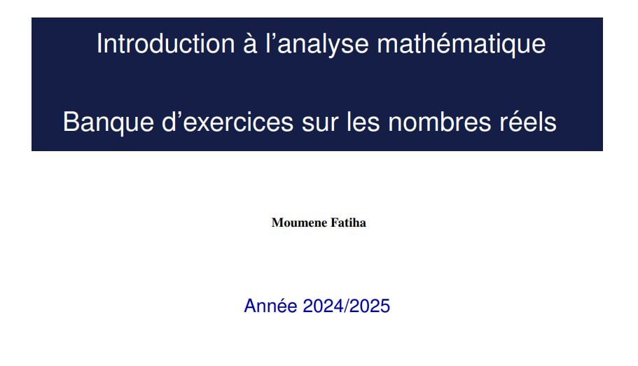 Ce fichier propose une **banque complète d’exercices sur les nombres réels**, couvrant différents niveaux et concepts fondamentaux pour les étudiants en mathématiques. Il permet de **s’entraîner efficacement**, de **renforcer la compréhension des propriétés des nombres réels** et de se préparer aux contrôles ou examens.