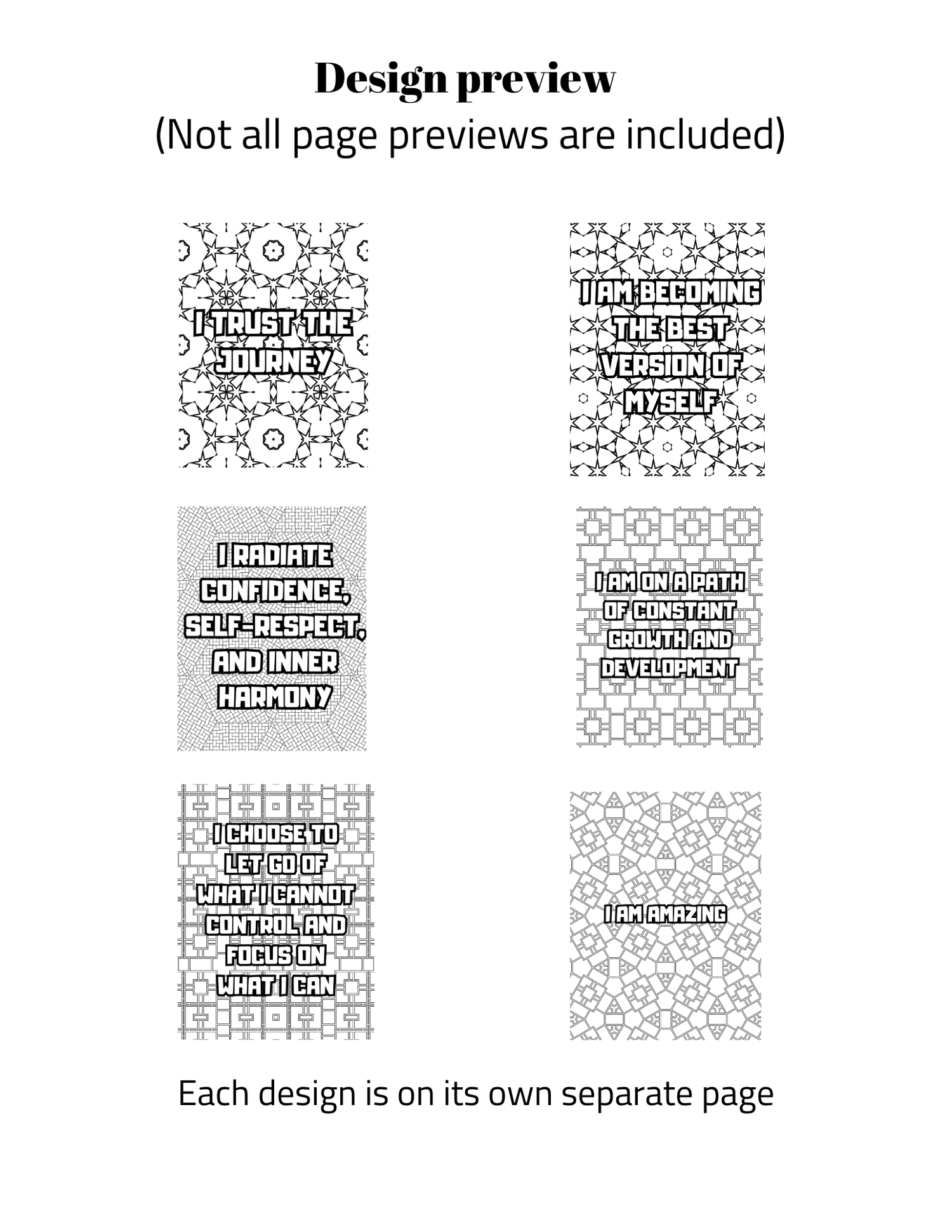 "100 Positive Colorable Affirmations: A Printable Coloring Book for Growth" is here to welcome you on a path of self-enlightenment and empowerment! This one-of-a-kind coloring book has been meticulously designed for people who are ready to take a life-changing journey toward something happier and more satisfying. Immerse yourself in a collection of 100 powerful affirmations carefully curated to inspire self-improvement and foster a positive mindset. Each affirmation is strategically chosen to empower, motivate, and encourage personal growth. Elevate your coloring experience with intricate patterns and designs that add a touch of elegance to each affirmation. Enjoy the flexibility of printing the pages at your convenience, allowing you to color whenever and wherever you desire. Whether you prefer the calming solitude of your home or the energizing ambiance of a coffee shop, this coloring book adapts to your lifestyle. Download and print your copy of "100 Positive Colorable Affirmations: A Printable Coloring Book for Growth" today, and embark on a transformative journey towards a more positive and empowered you!