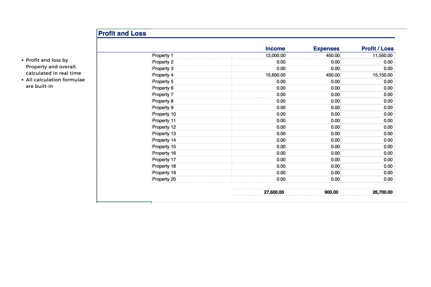 The categories included are based on those of the property element of UK tax return. These can easily be amended to reflect the requirements of your territory. All figures are presented in a currency-neutral style.