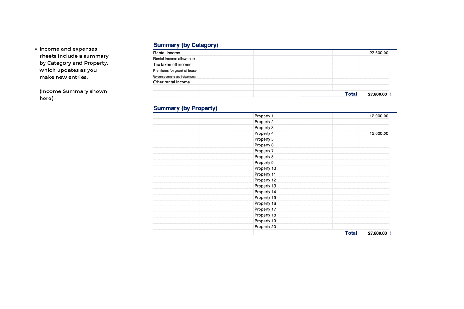 Choose appropriate categories and the relevant property as you make new entries. Summaries by Property and Income / Expense category as well as monthly, quarterly and annual totals calculate automatically.