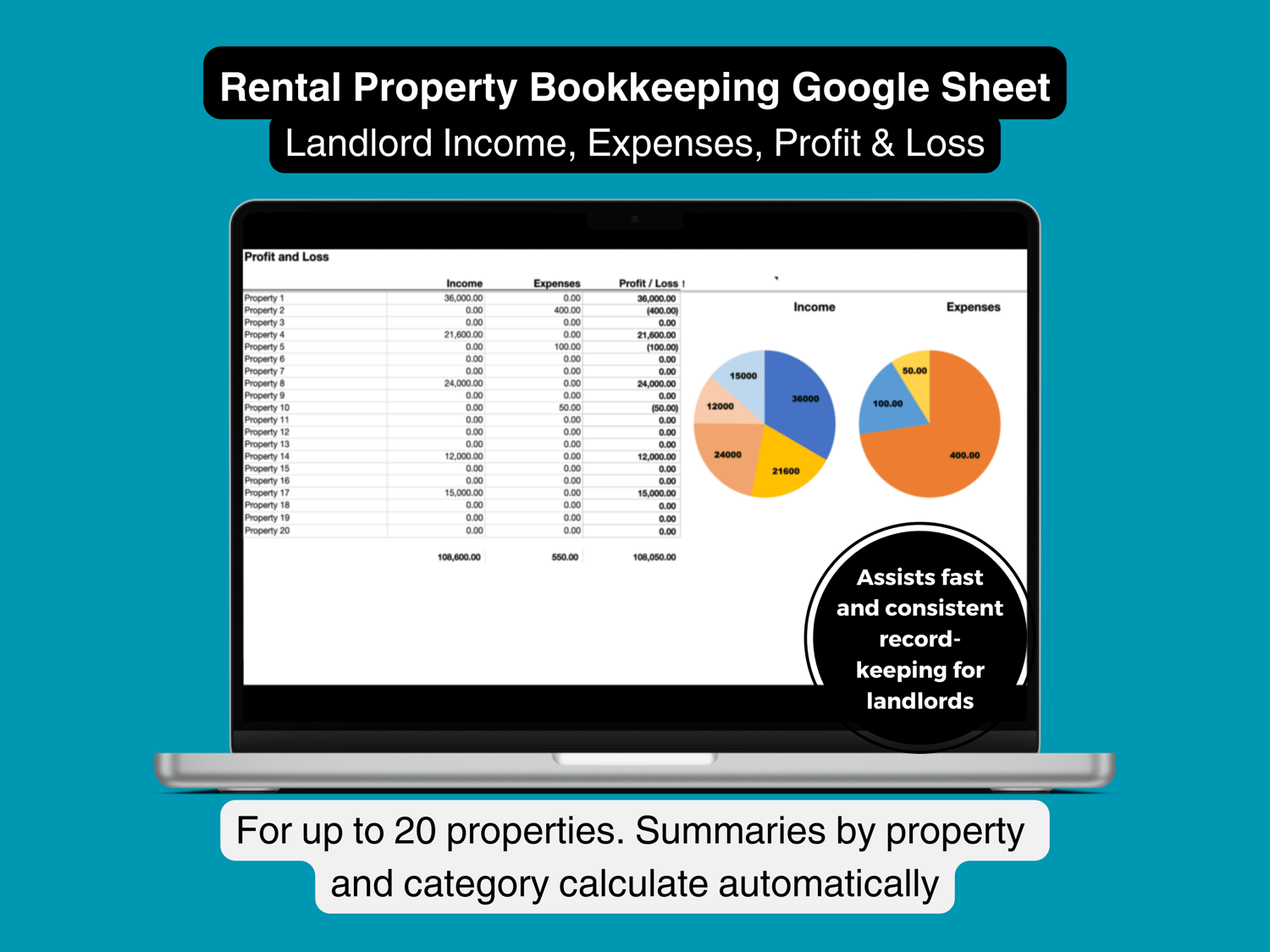 Landlord / Rental Property Bookkeeping / Accounts spreadsheet. Record your income, expenses and profit with ease. Google Sheets template