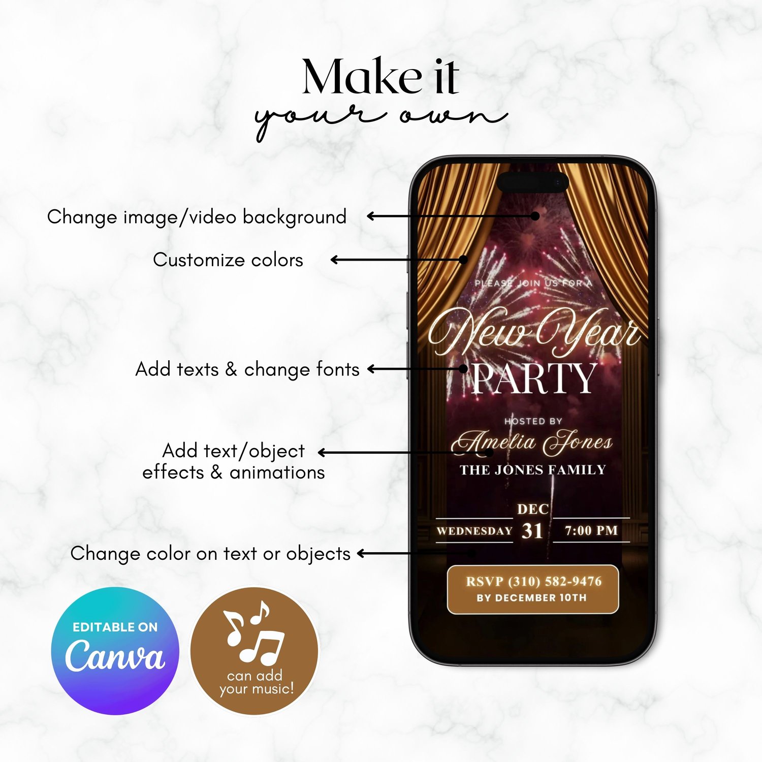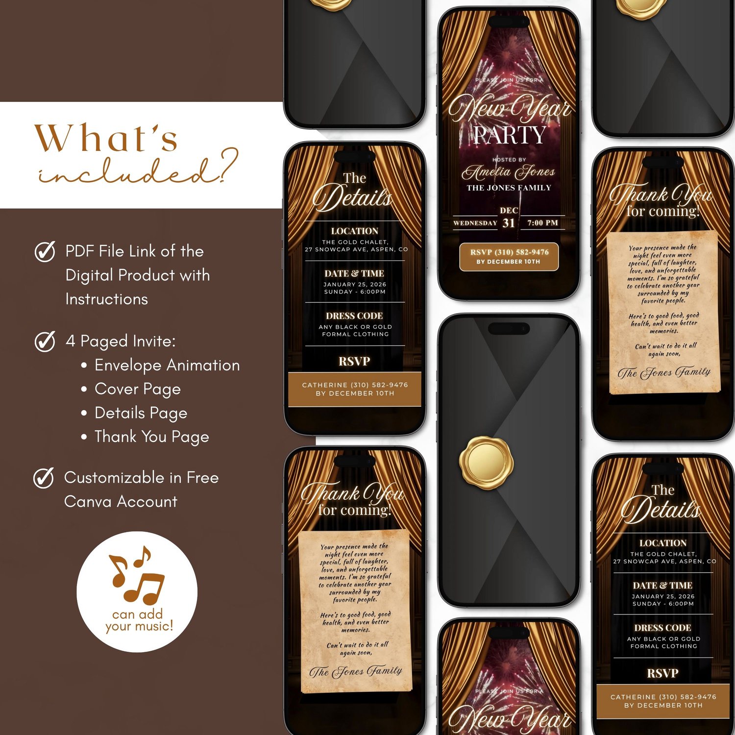 ⭐ Luxury New Year Party Digital Invitation Template | 4 Editable Animated Canva Pages | NYE Party Invite 2026 ⭐