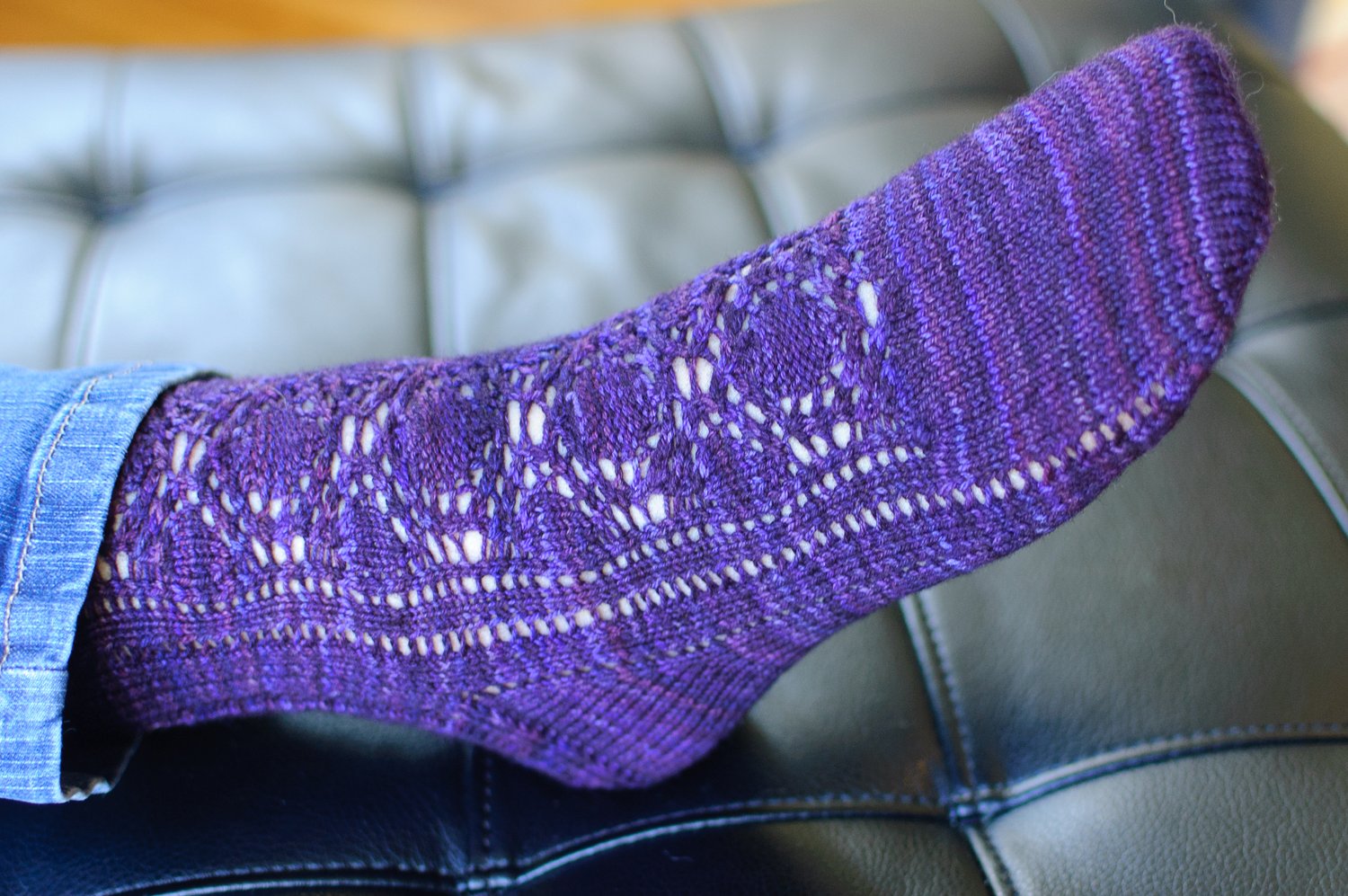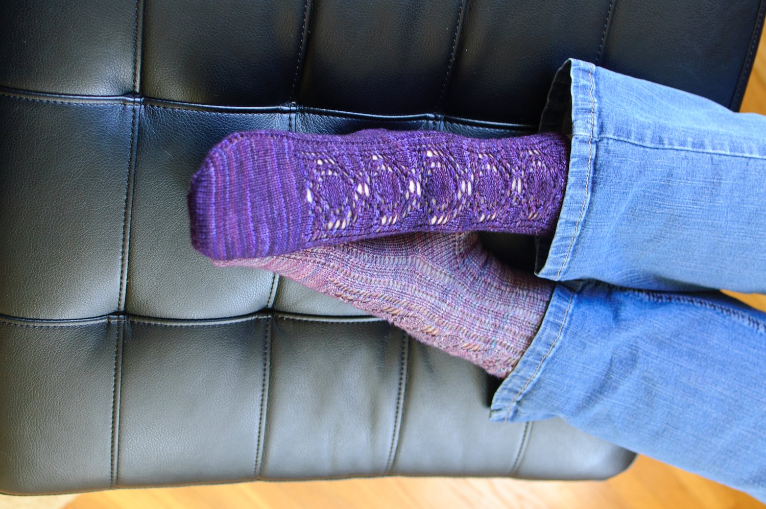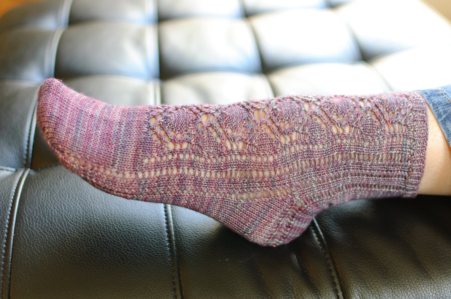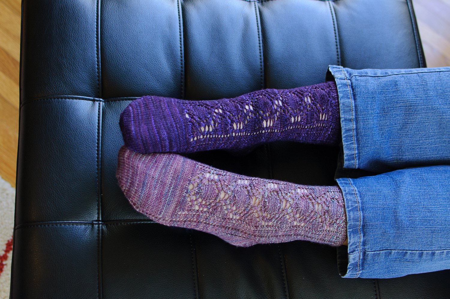Encode is a toe-up sock with a fancy lace motif that reminds me of the Enigma disks. It has a gusseted, flap heel worked from the bottom up. Decode is a cuff-down sock with the same fancy lace pattern. It has a gusseted, flap heel and standard toe.