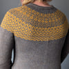 Working from the top down in the round you will create a double roll top neckline followed by a colourwork patterned yoke that then splits into body and sleeves. The body is finished with a repeat of one of the yoke patterns. The sleeves, picked up from the yoke are knitted in the round and end with another repeat of a pattern to compliment the yoke.