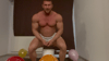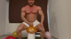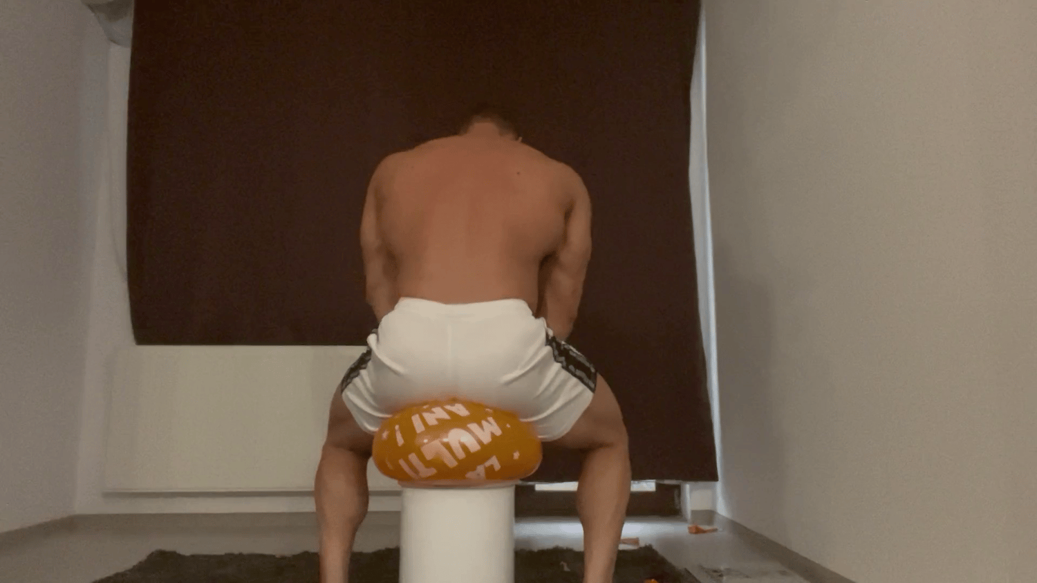 Muscular god Walter sits on some balloons while wearing white shorts.