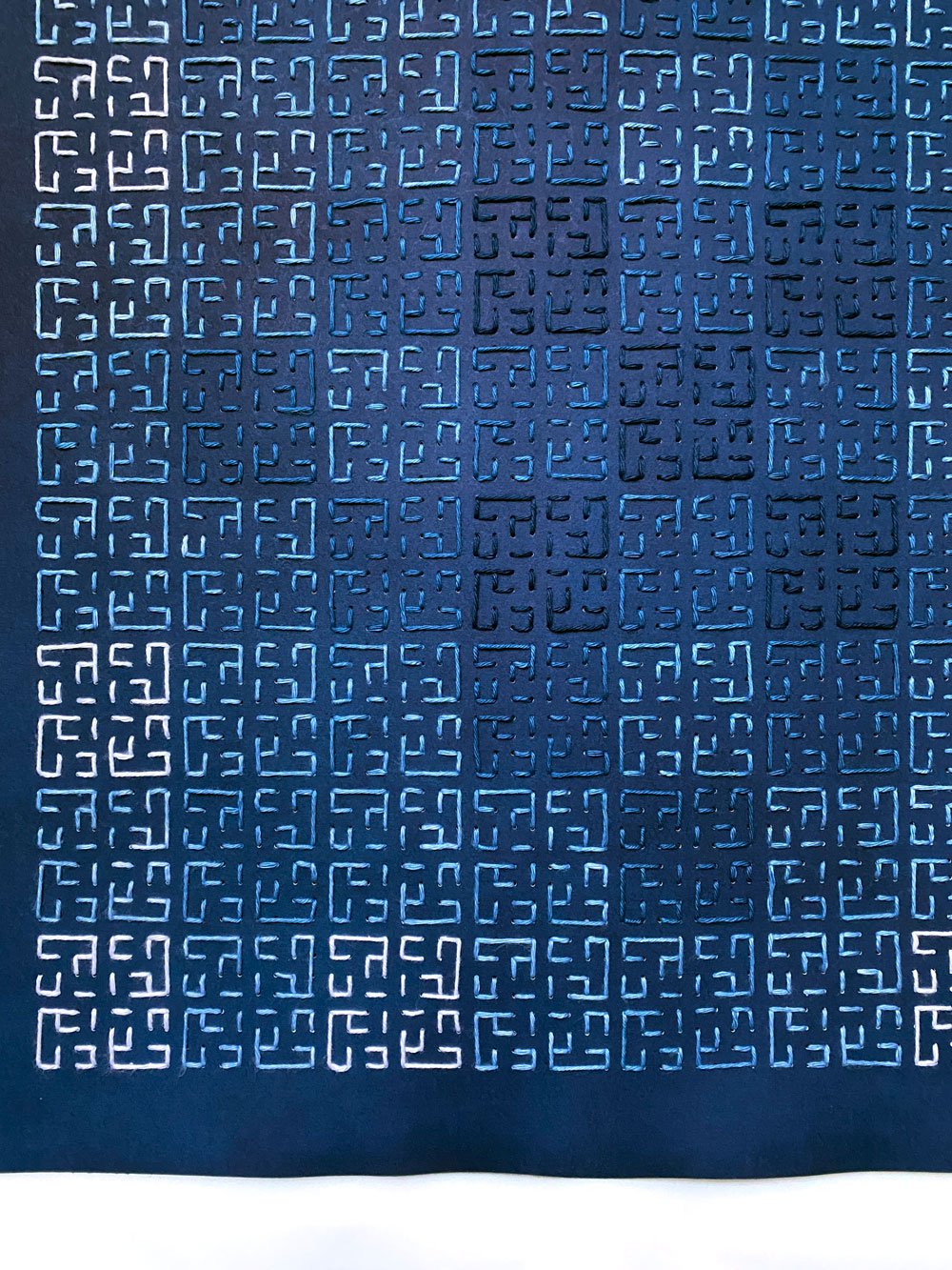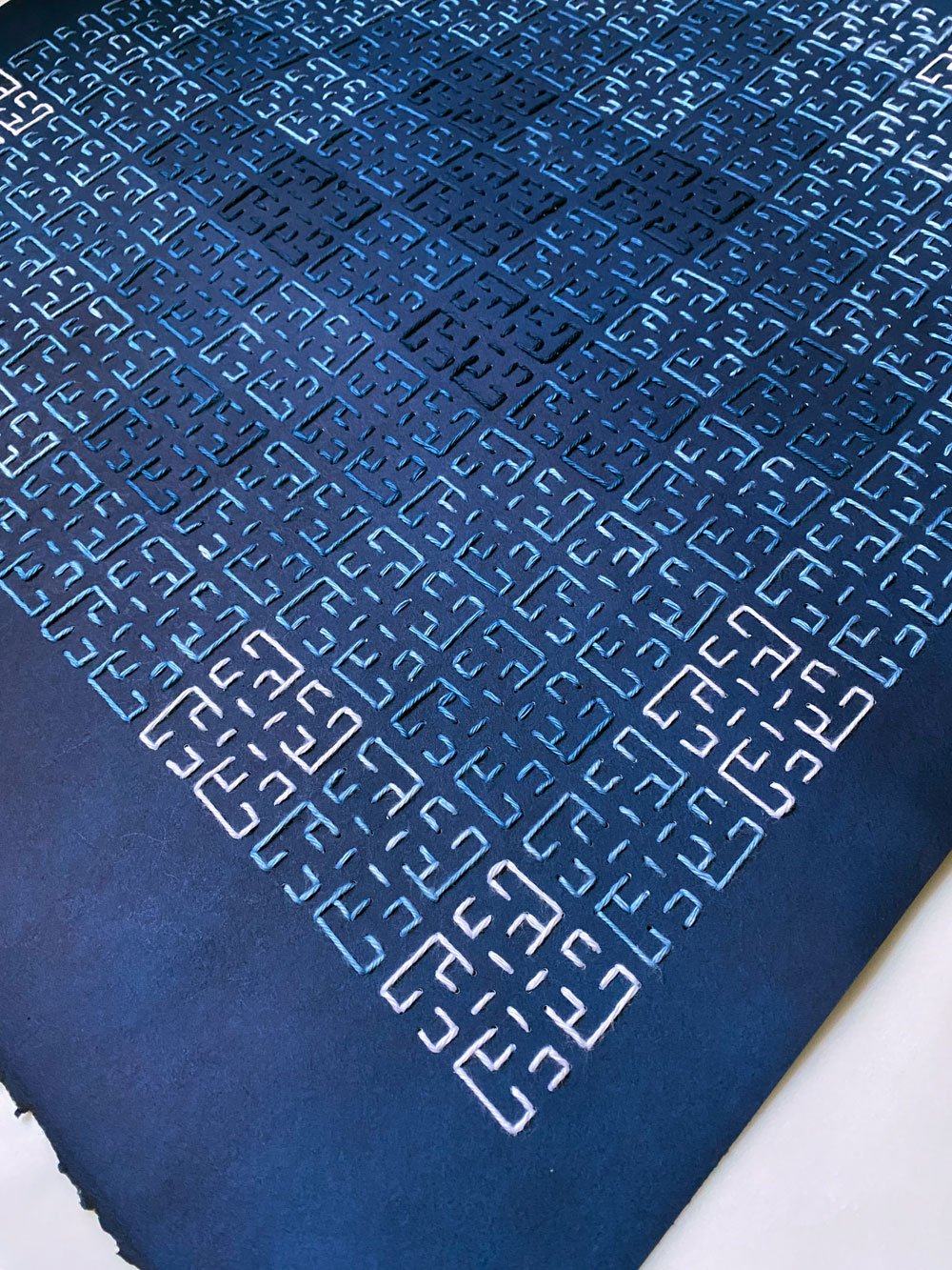This piece is stitched with cotton thread on Arches paper, both dyed in different shades of natural indigo in my studio. In Palestinian embroidery, once widespread in the Middle East, embroidery of dark blue on dark bliue was used to signal mourning. This is part of a Mourning series, my response to the endless bad news and heartbreak of the past year in particular, acknowledging the grief caused by every loss of life or cultural heritage. But the point of it isn’t to underscore the bleakness of this moment in history. It’s that mourning is essential. We mourn because we love, and because we know the value of what is lost. That is itself a light in the darkness.