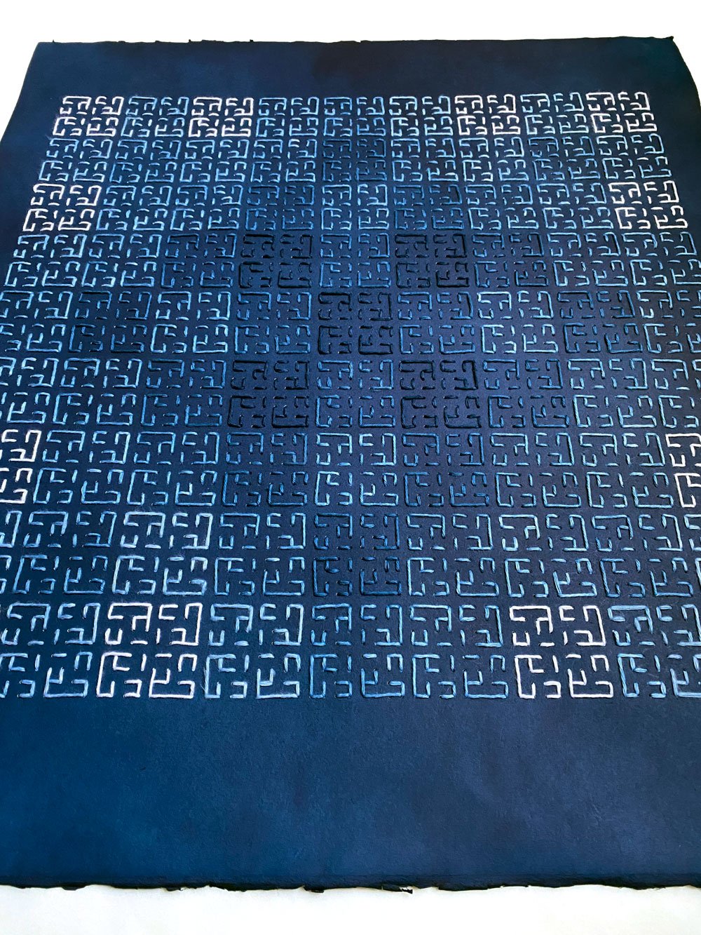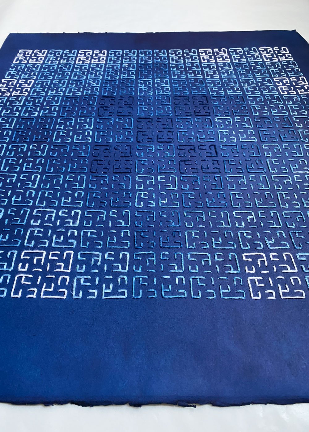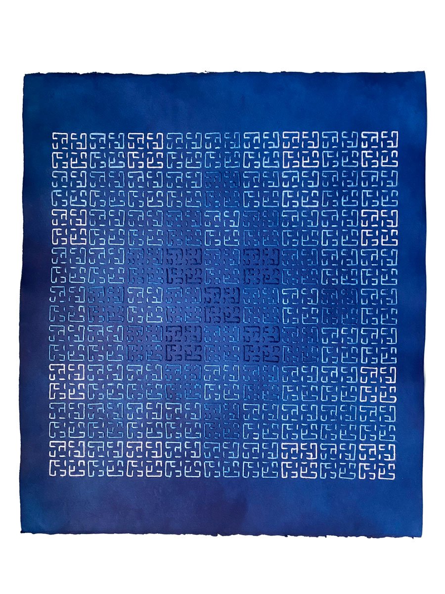 Cotton thread, hand-dyed with indigo, stitched on indigo-dyed paper, 50x57 cm.