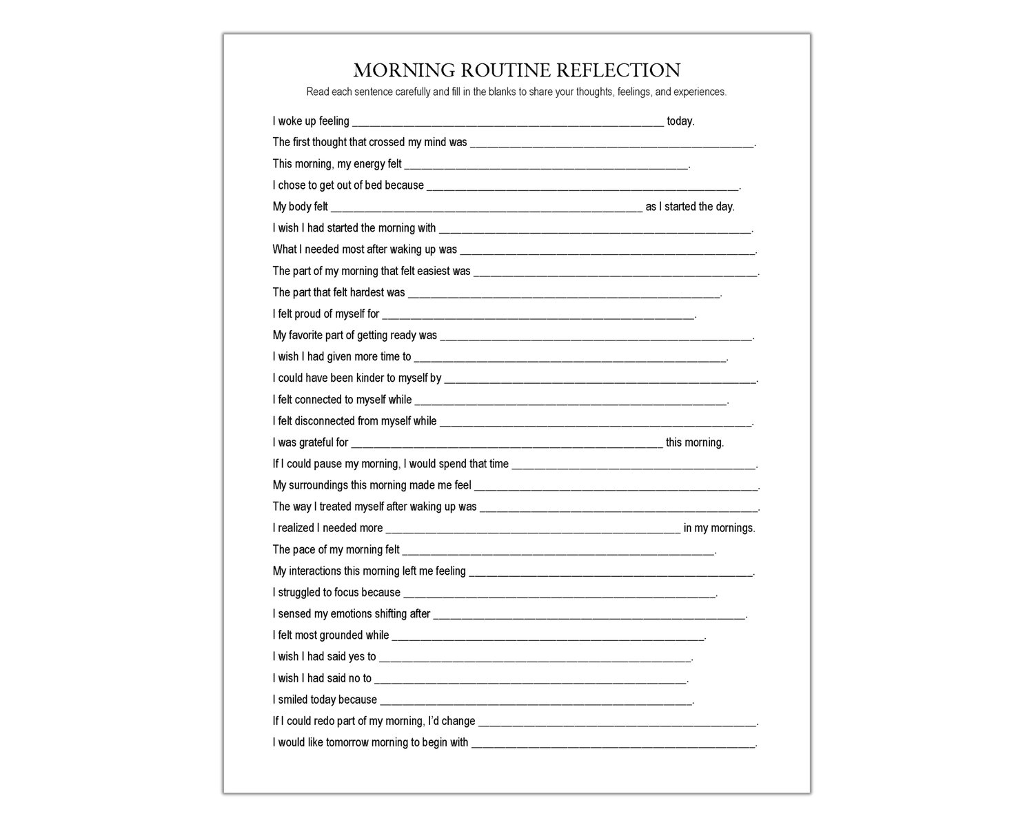Start your day by checking in with yourself and seeing how you truly feel with this Morning Routine Reflection worksheet. This resource features 30 prompts to guide you through appreciating your current routine and noting what serves you best. It works well for therapy, journaling, self-reflection, or even group activities. Reshape your habits and begin making mornings your favorite part of the day.