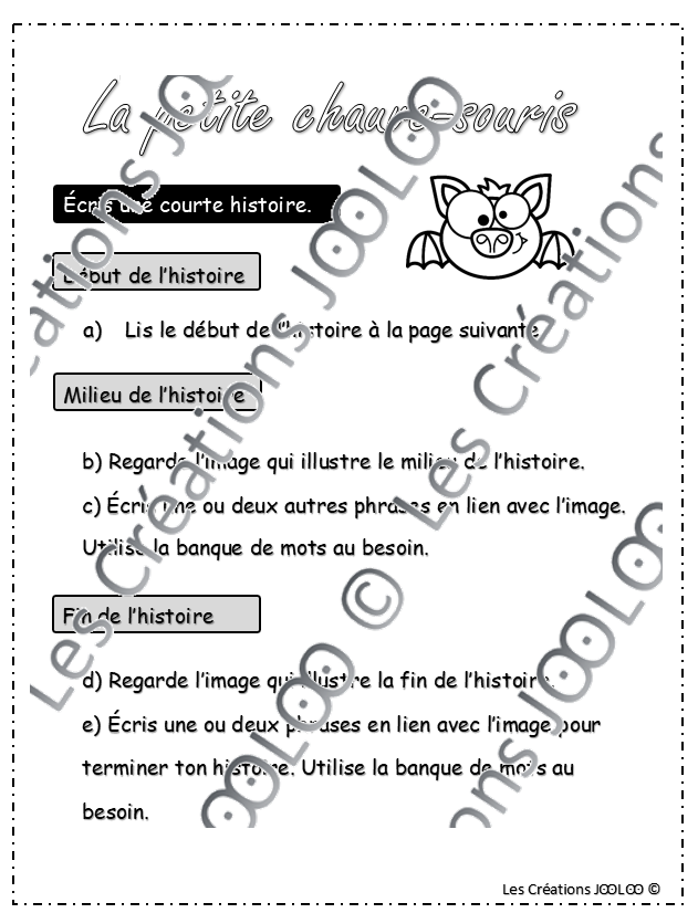 Voici une situation d'écriture clé en main pour les élèves du 1er cycle afin de travailler le schéma narratif simple. L'élève doit composer le milieu et la fin d'une histoire à l'aide d'une banque de mots et d'images.