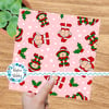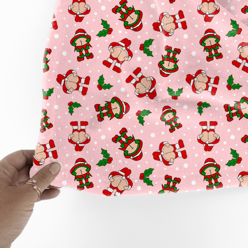 A sarcastic and cheeky Santa and Elf bearing their backsides on pink.