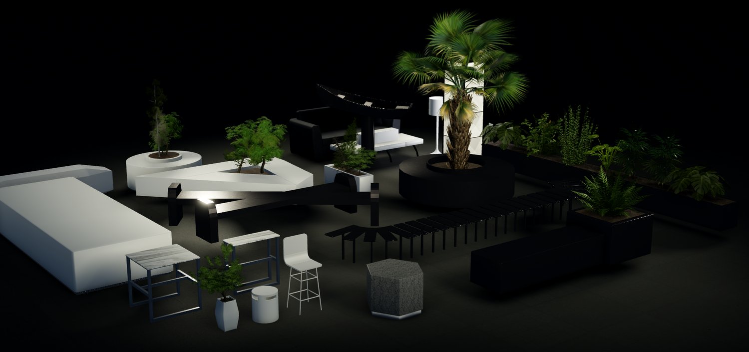 A decorative pack with various seats, modern tables and other decorations that you can use indoors or outdoors.