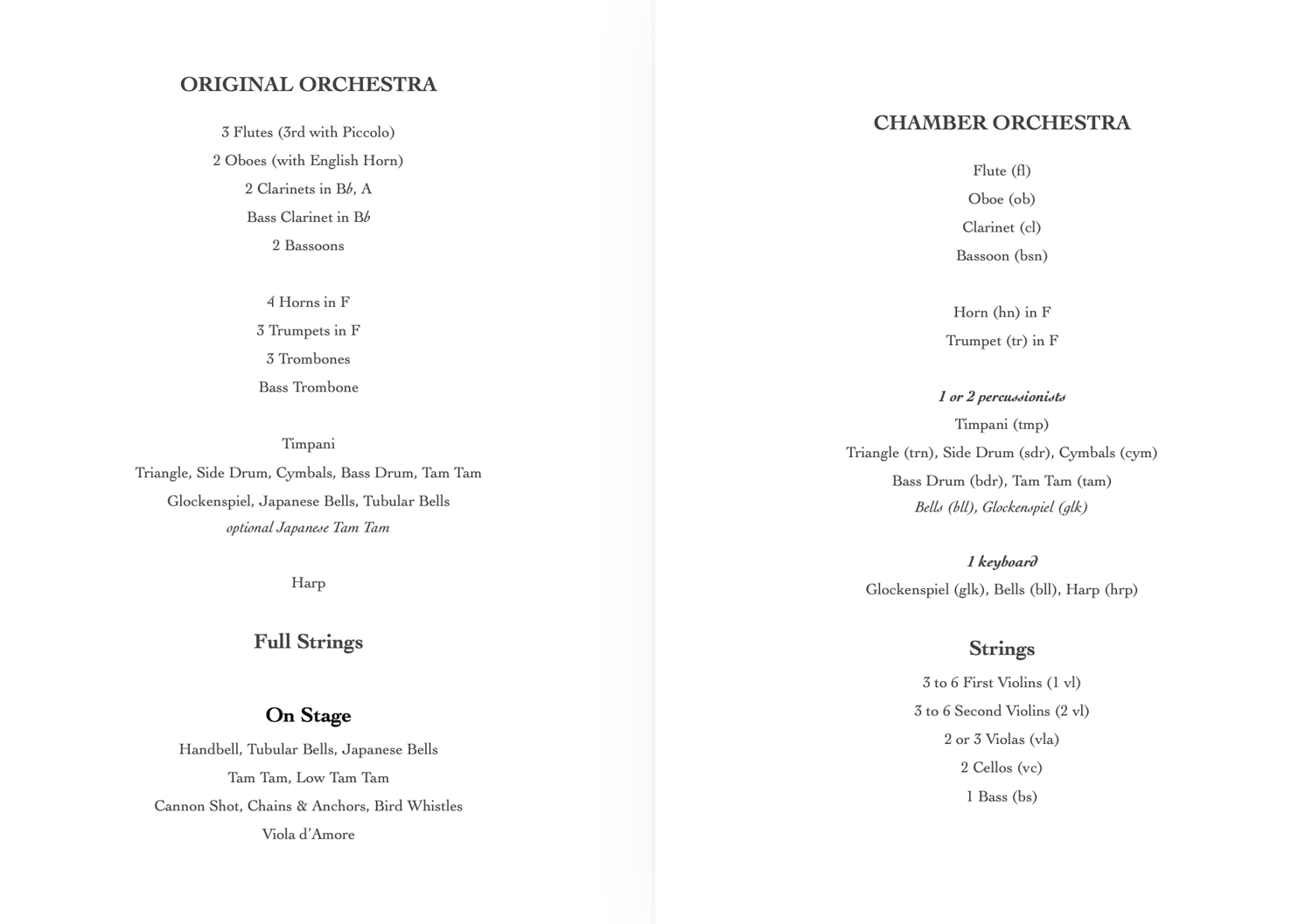 Puccini scored Madama Butterfly for a full late-Romantic pit typical of verismo opera: strings, a substantial woodwind and brass section, percussion (including exotic percussion effects), harp and an on-stage samisen/choral-like colour when required. Typical modern full productions use 60–80 players. The opera’s melodic clarity and intimate scenes make chamber reductions feasible: a carefully arranged version for 20–30 players preserves core textures and vocal balance. Butterfly for Chamber Orchestra requires: