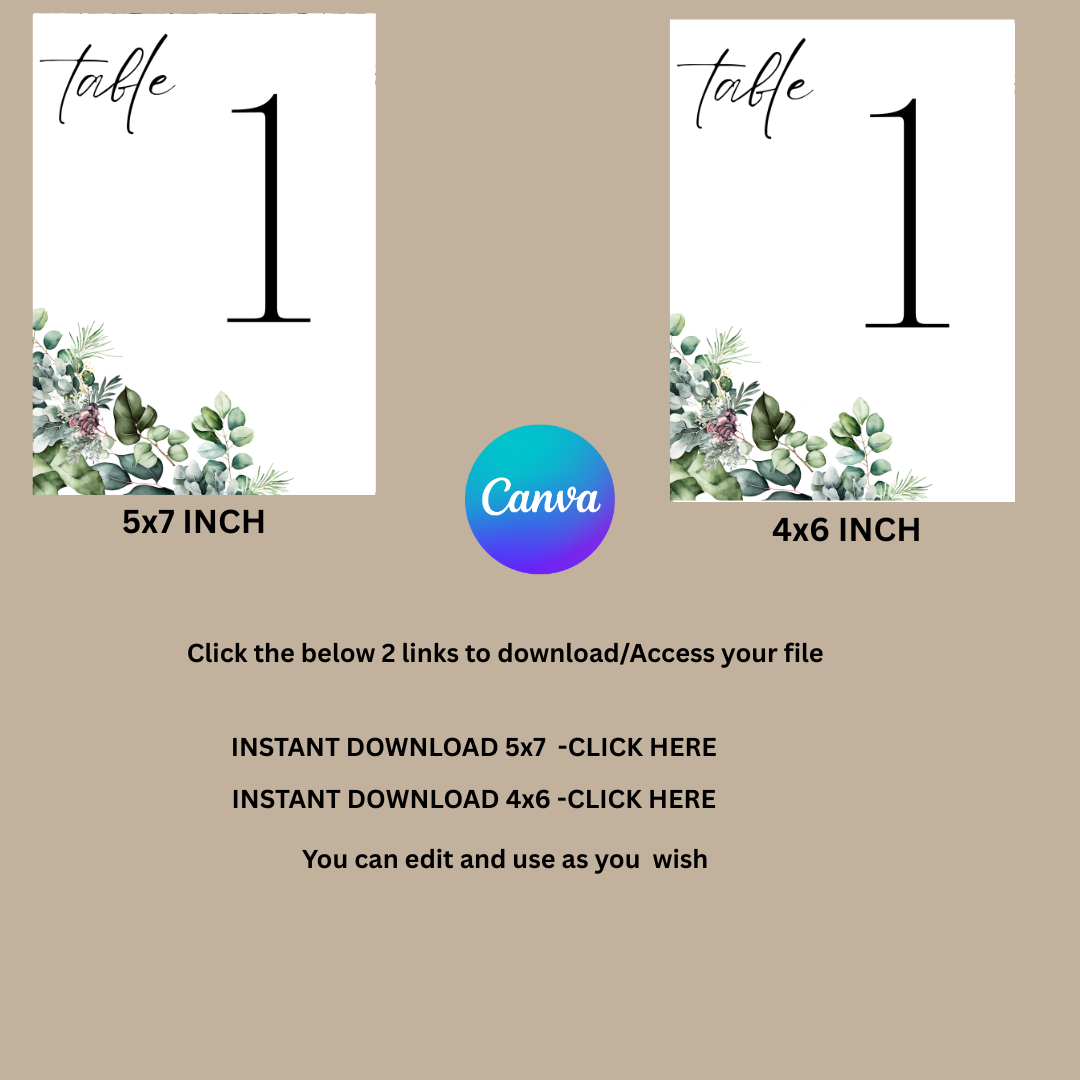 Edit everything in Canva—change wording, numbers, fonts & colors. Print at home or at any print shop. Perfect for DIY brides or planners wanting a complete matching table number set without hiring a designer.