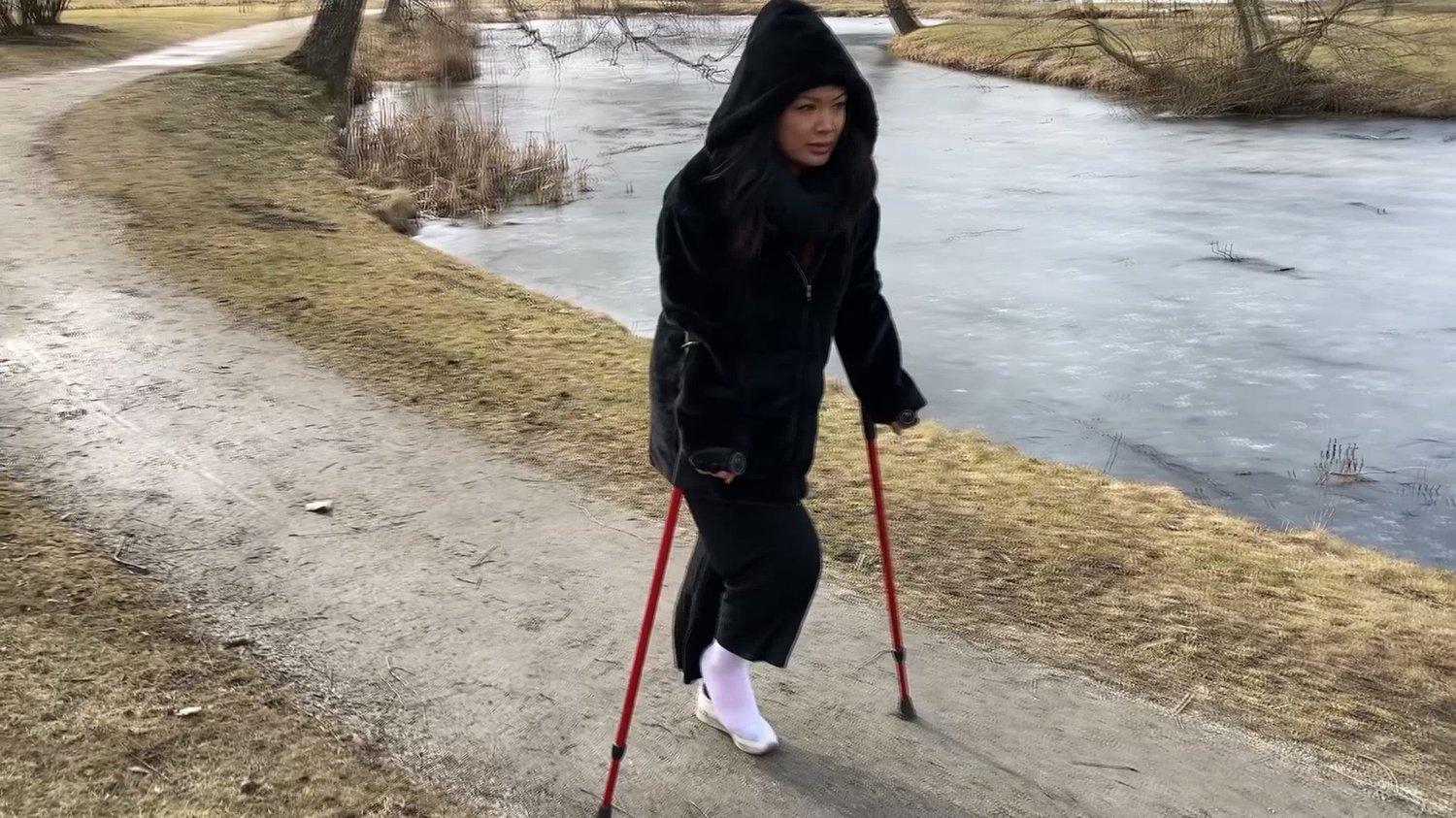 With a sock over her cast crutch Bunny with her bent LLC in the park.She put up her leg on a crutch so we can see that it is a long leg cast she has.She crutch around in the park a while before she arrives at the exit which is a spinning gate.Getting through this with an LLC was probably harder than Bunny had thought but after fighting for a while crutch she moved on to the parked car