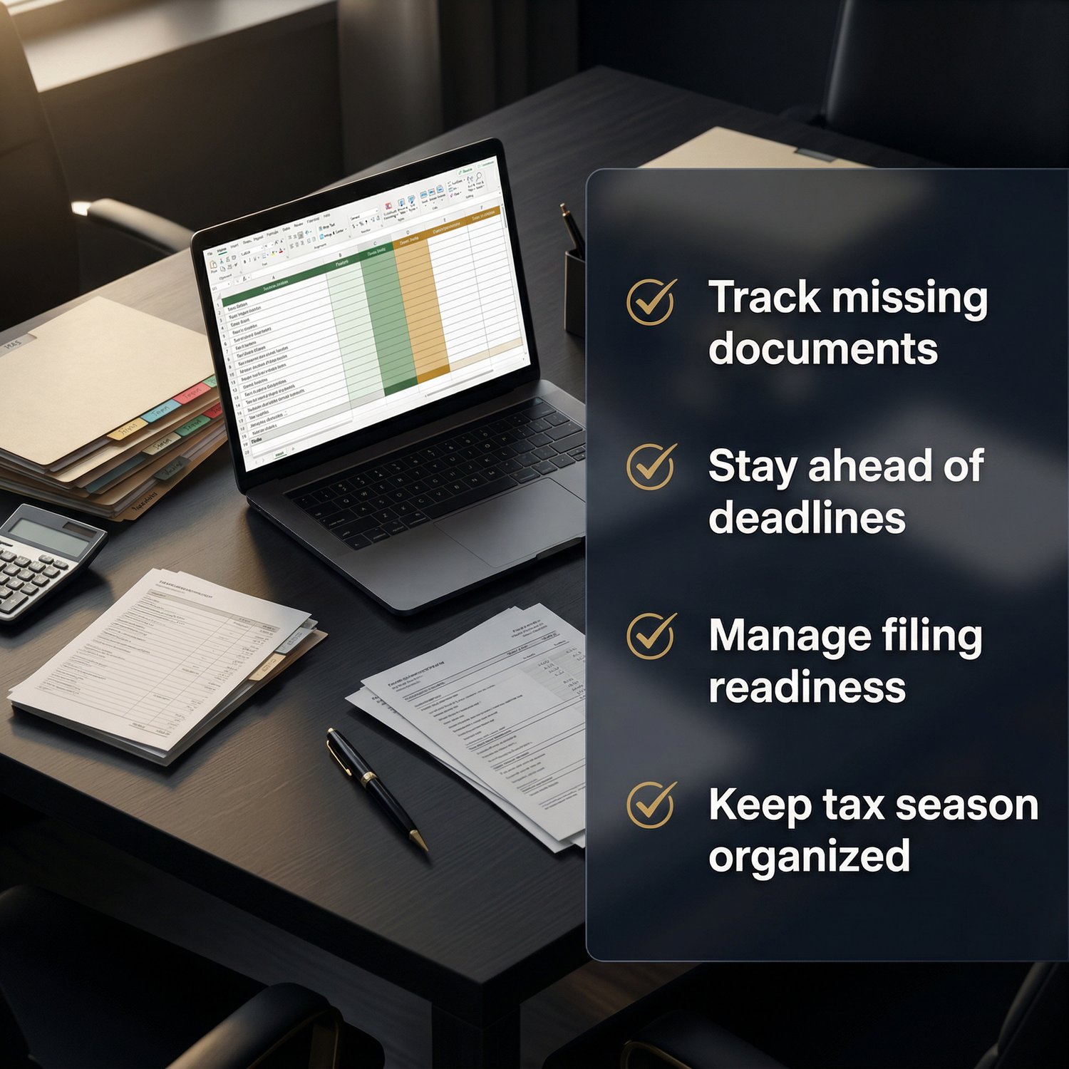 Inside this bundle, you get a fully editable Excel and Google Sheets workflow designed to help you monitor every client from intake to filing, reduce missing-document delays, improve follow-up consistency, and create a more organized tax-season process.