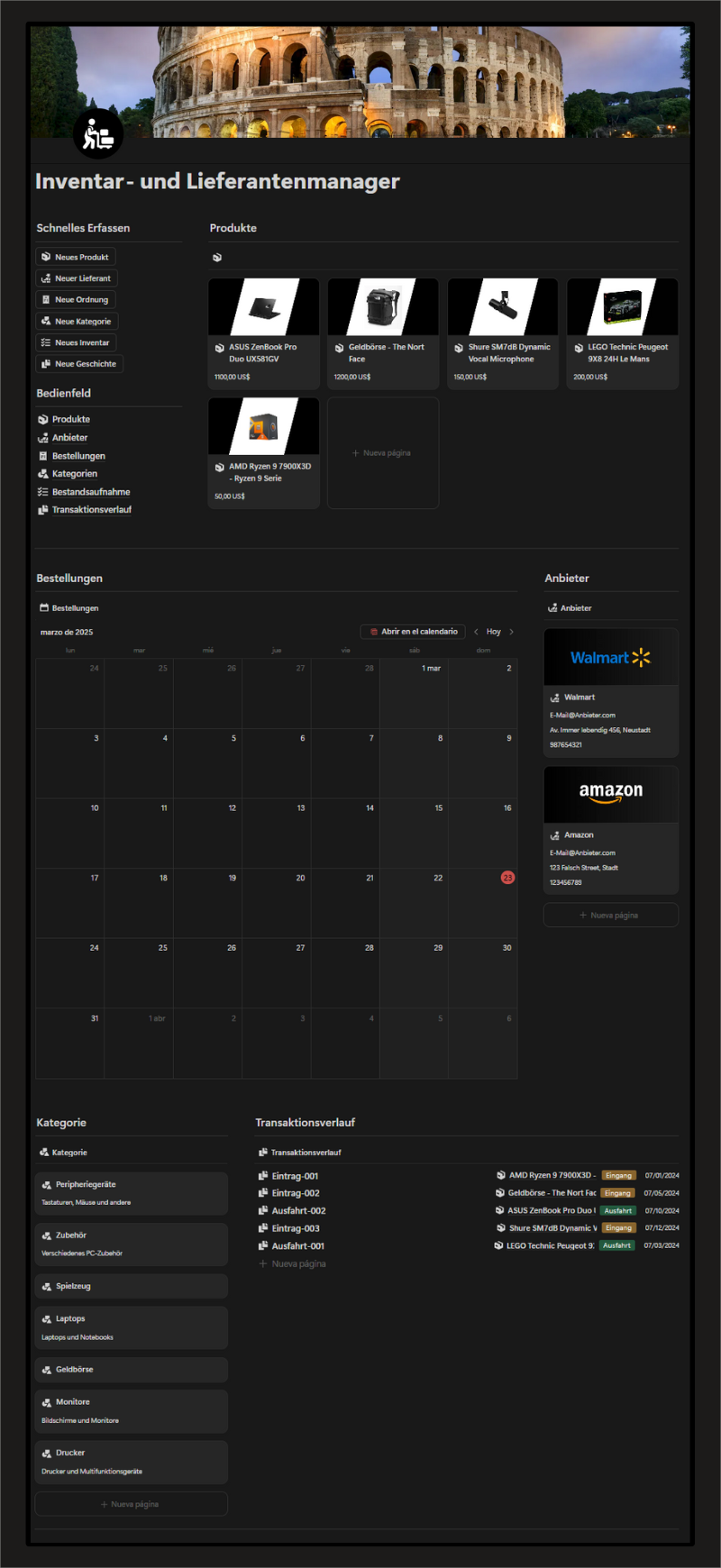 Optimiere dein Bestands- und Lieferantenmanagement mit der Inventar- & Lieferantenmanager-Vorlage für Notion. Diese Vorlage hilft dir, deine Produkte und Lieferungen zu organisieren, zu verfolgen und die Kontrolle zu verbessern.
