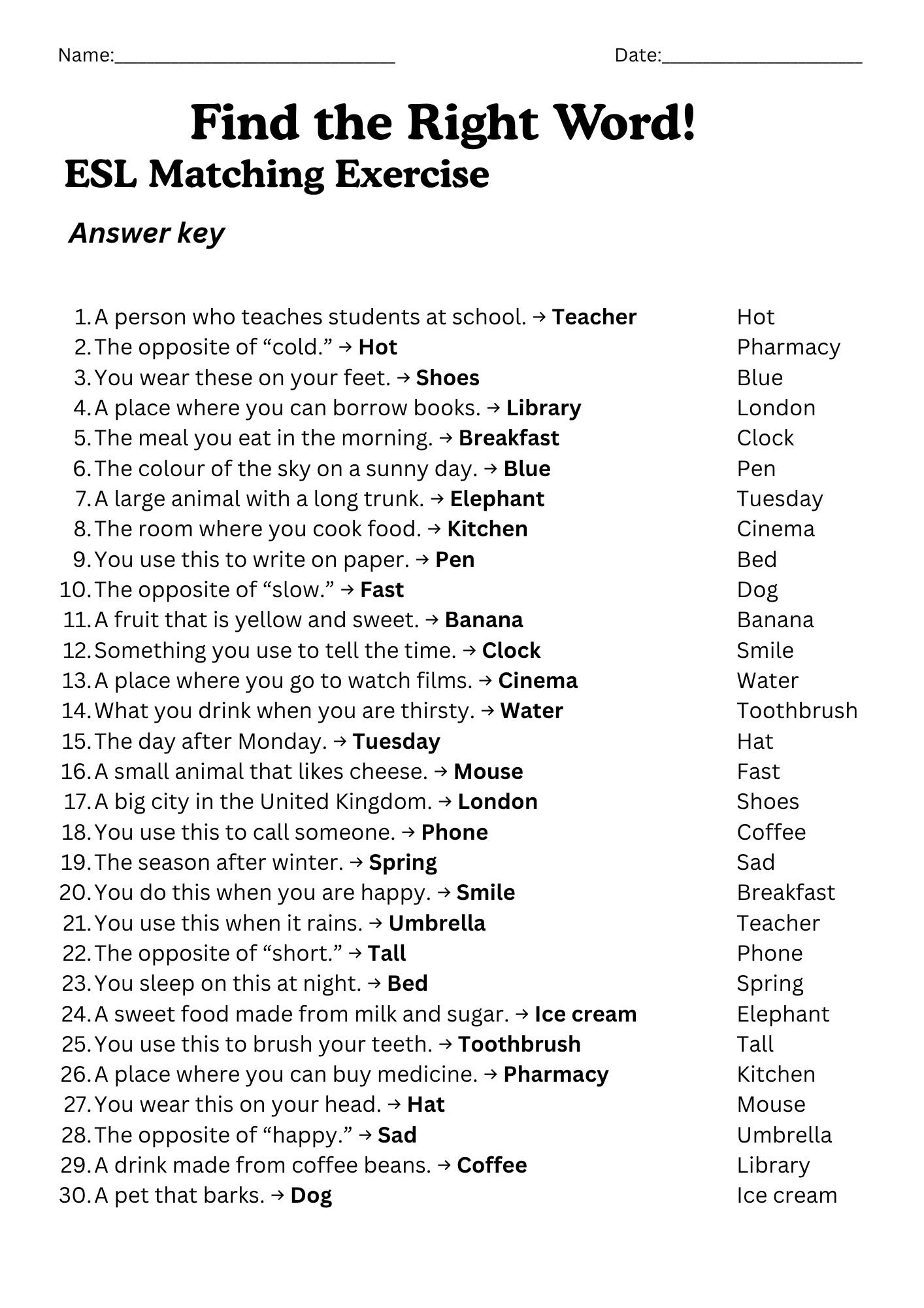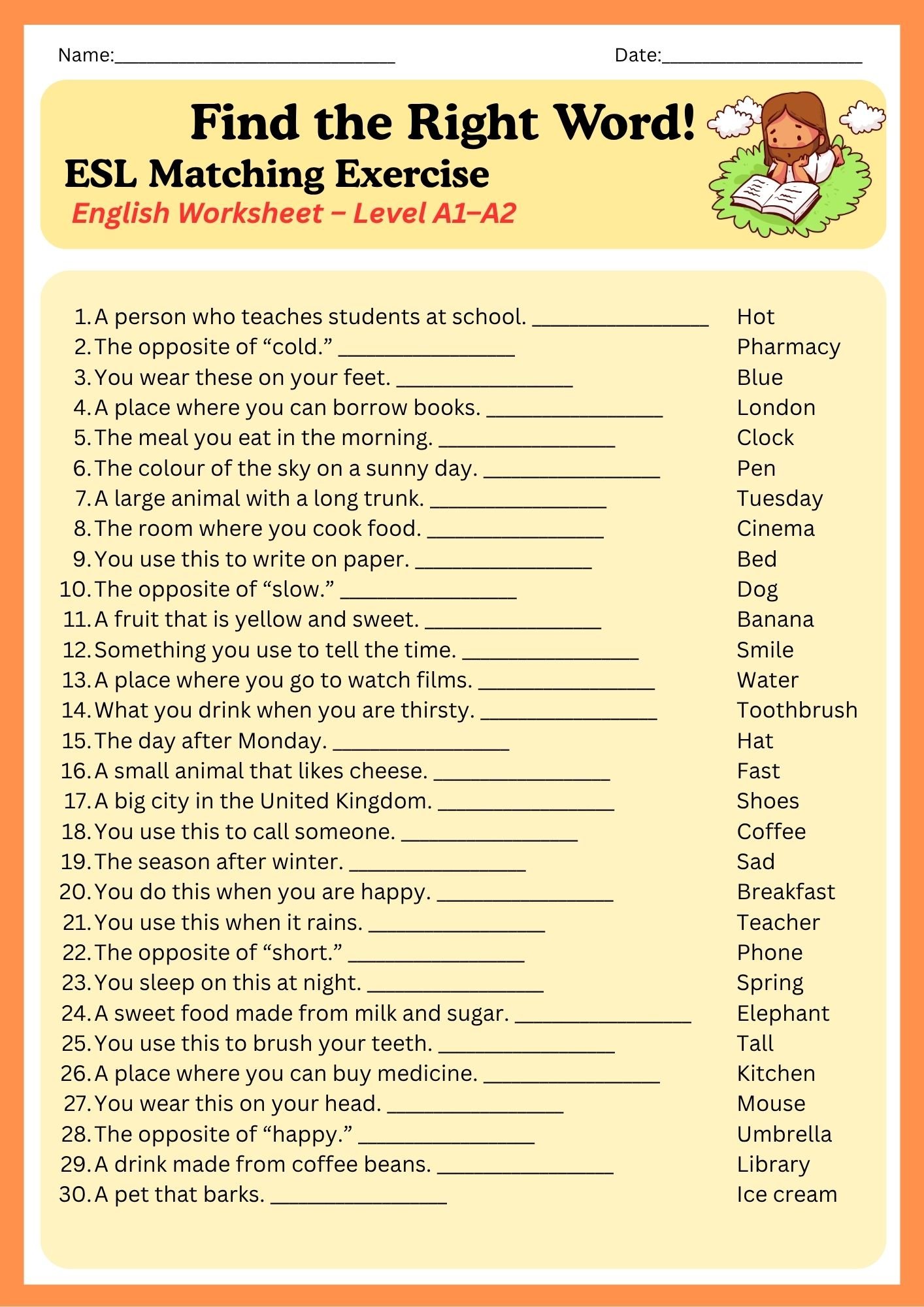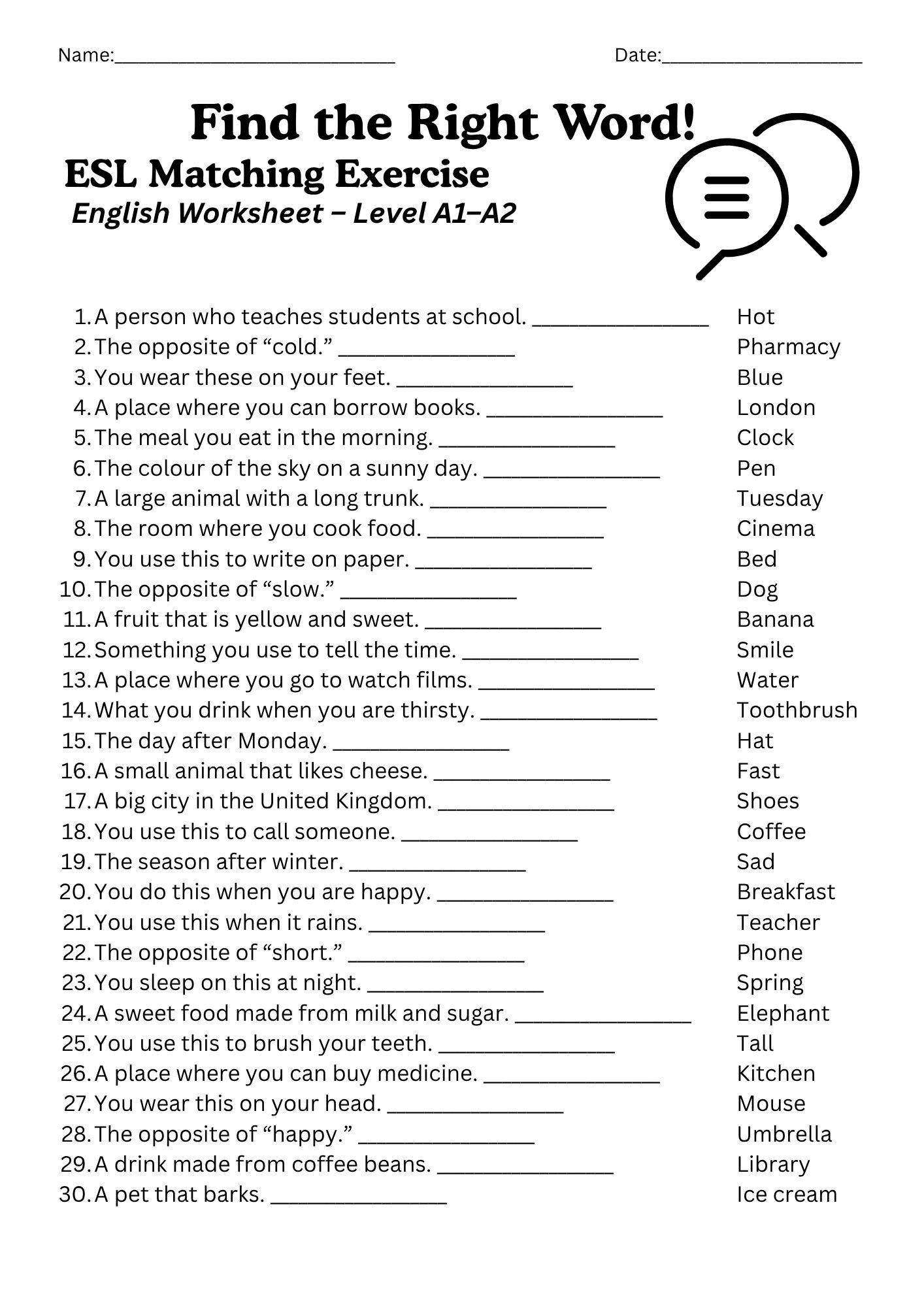 This ESL worksheet for levels A1–A2 helps learners practice everyday vocabulary by matching 30 short descriptions with the correct words. Perfect for beginners and young learners!