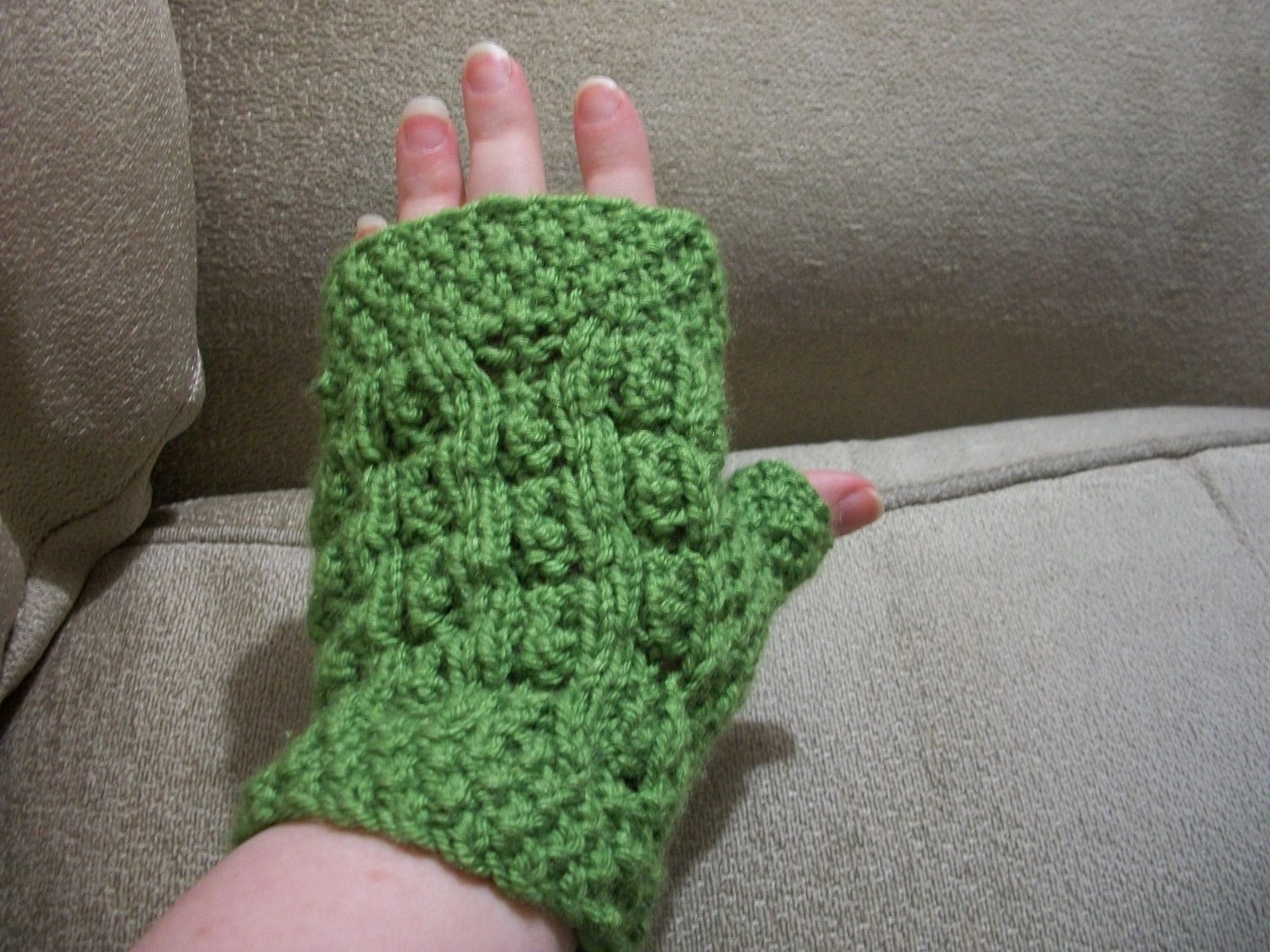Instructions are given for adjusting the width of these mitts to any size, but the pattern as written provides for one size only.