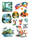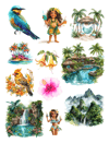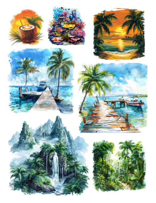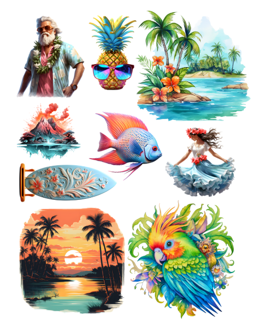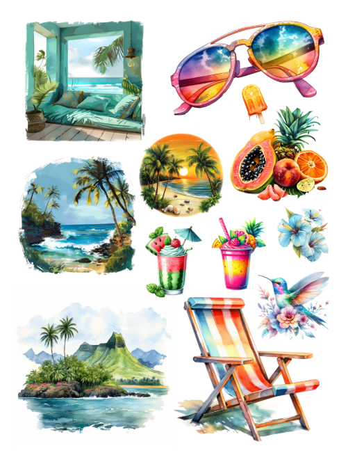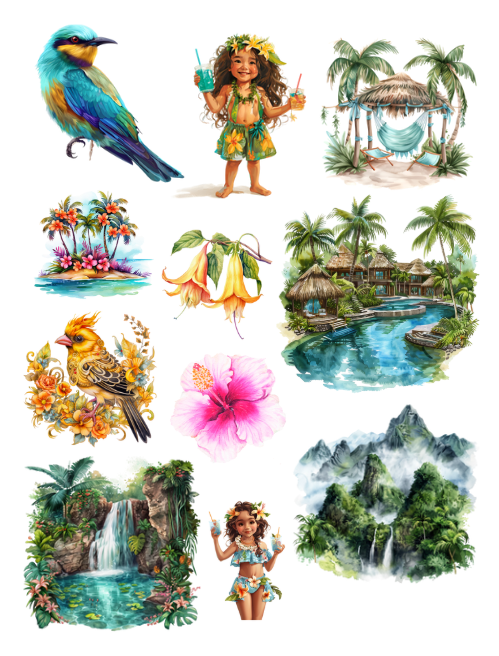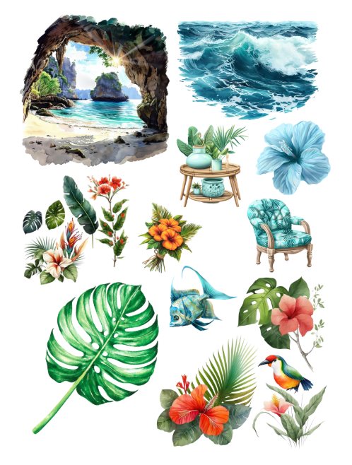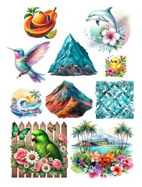 Pull out your scissors and glue and dive into the magical world of tropical ephemera with tropical fish, tropical fruits, surfboards, mermaids, tropical flowers, parakeets, parrots and birds, luau dancers, shells, dolphin, shark, bathing suit, pool party scenes and inflatables, ice cream, flip flops, beach scene, flower arrangements, leaves, drinks, grandma, masks, beautiful girls, palms, turtles, surf, orchids and much more with this artistically beautiful ephemera book.