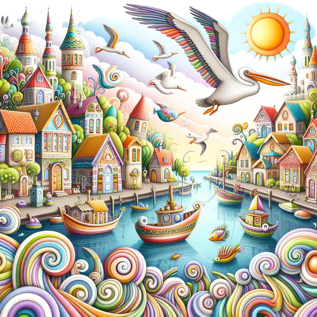 A whimsical world. A seaside village of quirky houses made of mosaics, looking across at blue sea where whimsical boats ride on curly waves, Fish leap high out of the water, and a pelican scoops a fish into its mouth.