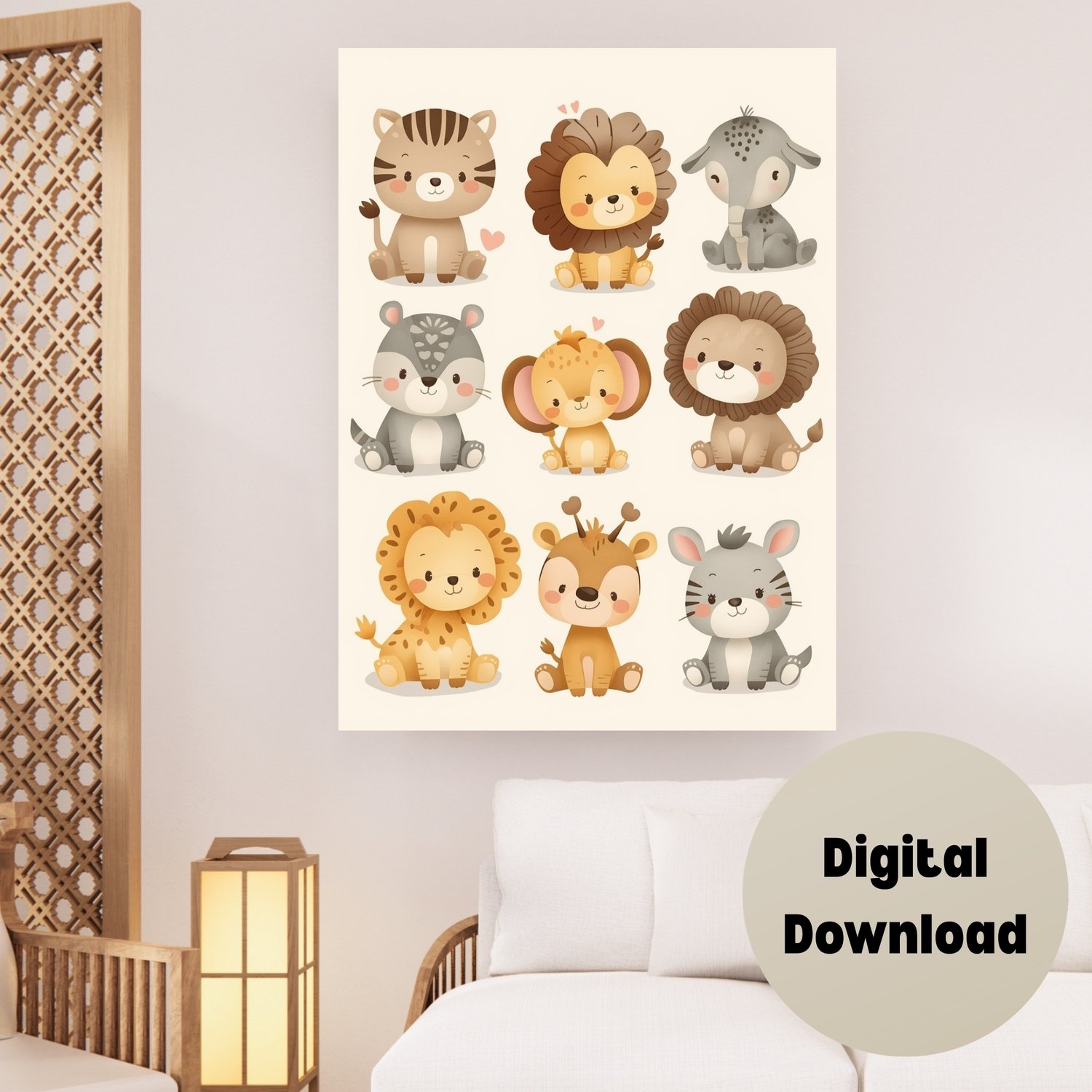Create a warm and happy space for your little one with this adorable baby animals illustration. Designed in soft pastel colors with charming smiling characters, this artwork brings joy, comfort, and playful energy to any nursery or kids’ room.