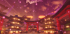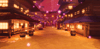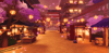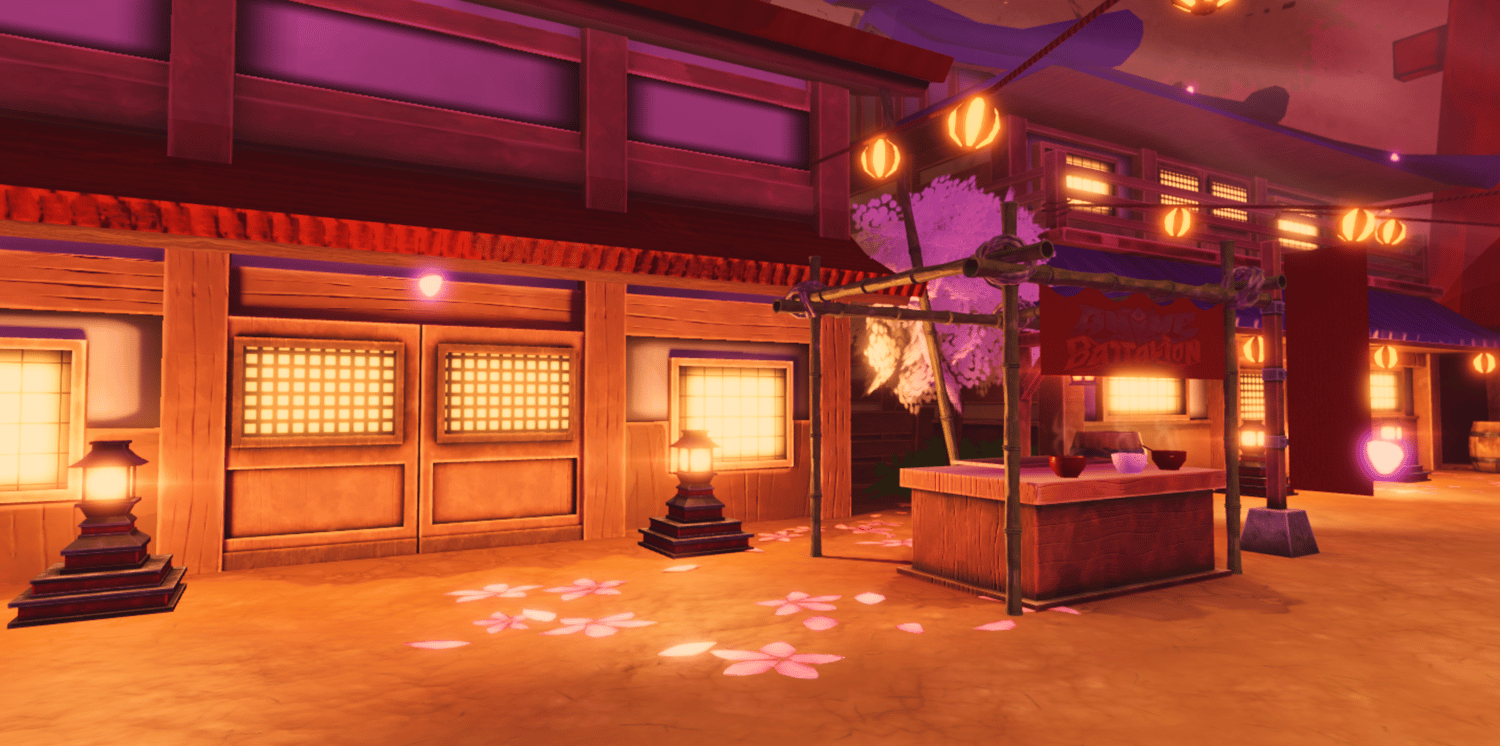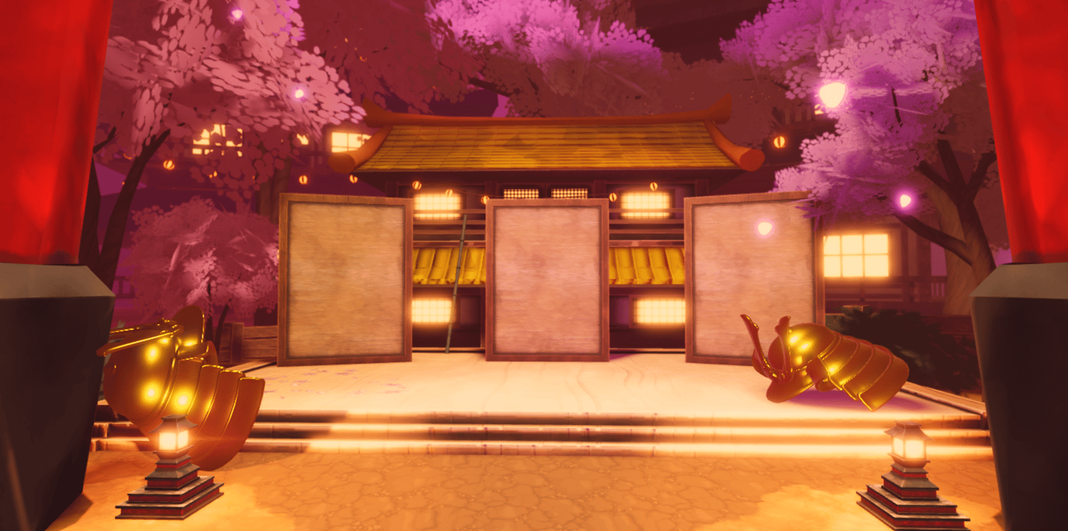 A stunning stylized Japanese festival village bathed in warm lantern light and falling cherry blossom petals. The environment features multi-tiered pagodas, towering torii gates, bustling market streets with food stalls and vendor stands, and a central stone plaza surrounded by traditional wooden buildings. Glowing paper lanterns hang from strings across every street while pink and purple cherry blossom trees fill the sky with floating petals and particle effects. Interiors include wooden dojos with tatami-style flooring and shoji screen walls. A grand shrine entrance flanked by golden samurai helmets marks the focal point of the village. Warm golden and pink-purple lighting creates a dreamlike anime atmosphere throughout. Perfect for anime RPGs, samurai games, fighting game lobbies, Demon Slayer-style experiences, or any Japanese-themed project.