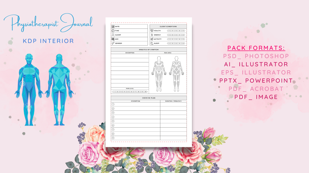 Instantly download "Physiotherapy Journal" in PDF format, ready to be uploaded to KDP with editable files in PDF, JPEG, PNG, PowerPoint, and AI - Illustrator.