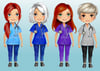 Nurses clipart with 4 hairstyles; each with 7 colours, 3 additional eye colours and 7 additional tunic and trouser colours to mix and match. Base model has blue eyes, light blue tunic and navy trousers