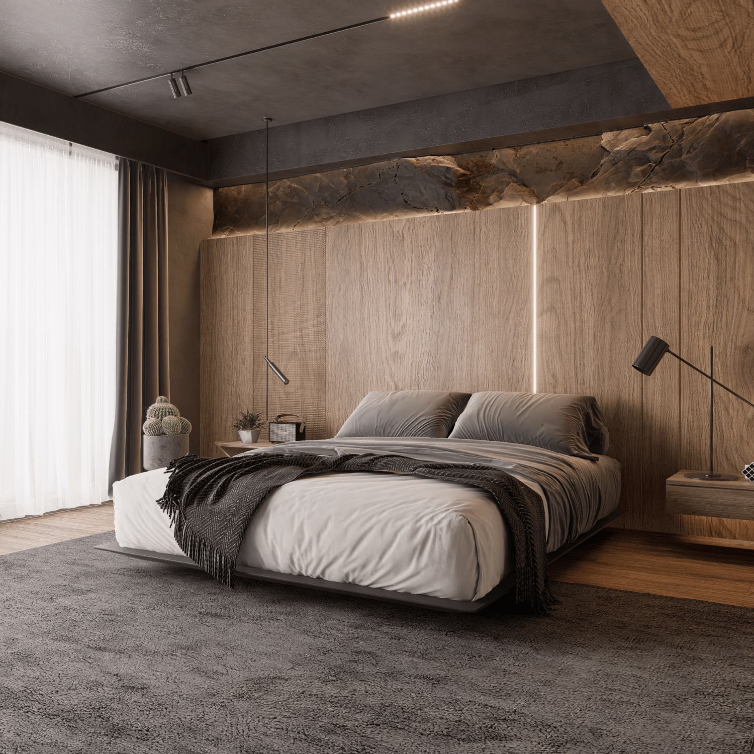 In this file you can explore about natural and artificial ilumination in a dark elegance bedroom, learn about curtian, veneer and fabric materiales.