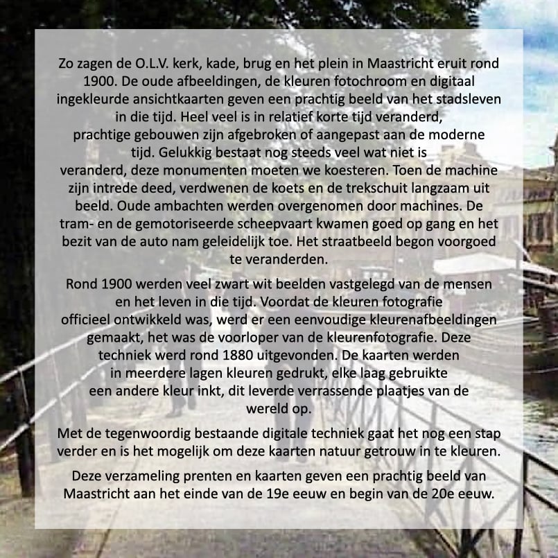 Prachtige gerestaureerde historische beelden en informatie over Maastricht de O.L.V. kerk, kade, brug en het plein die plaats en tijd overstijgt.