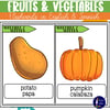 Kiddos will be able to review the fruits and vegetables with a partner or on their own and then they can be quizzed by a fellow classmate by them using their index and middle finger to cover the names of each on the bottom of each flashcard.
