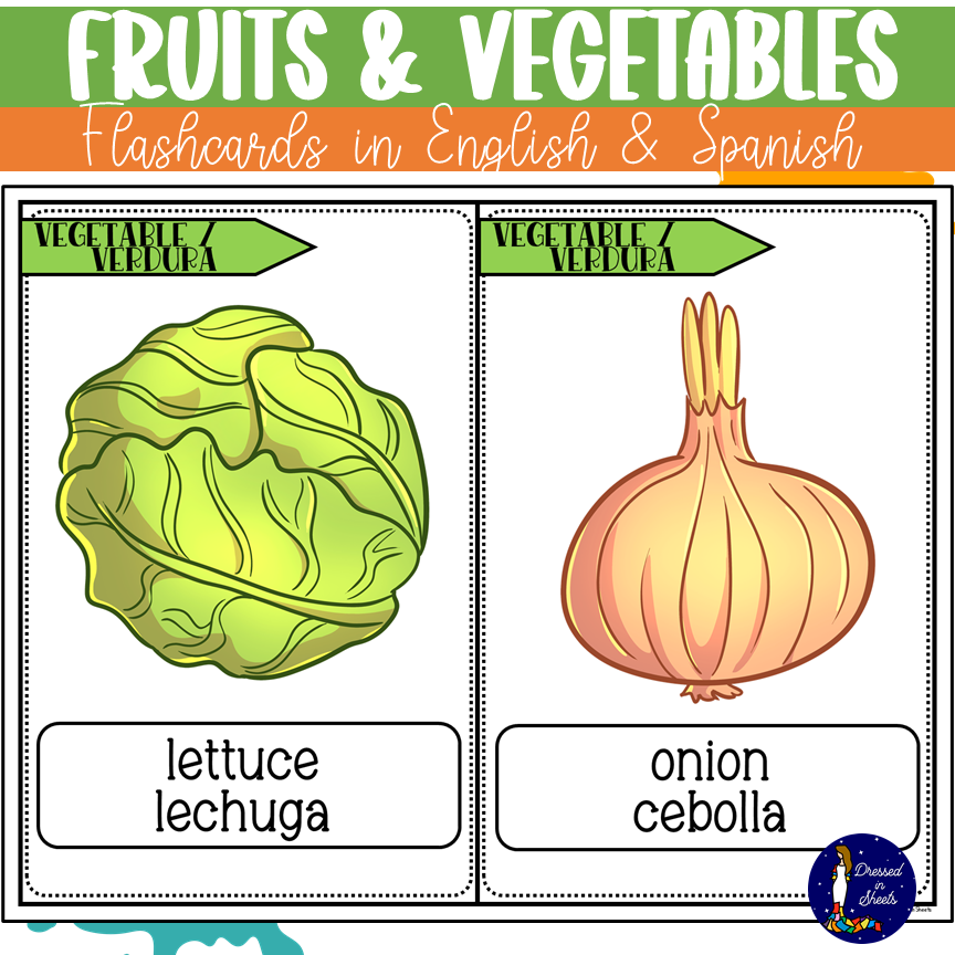 Each flashcard page set prints 6 flashcards. Each shows at the top whether it is a fruit or vegetable and it has their name on the bottom in both English and Spanish.