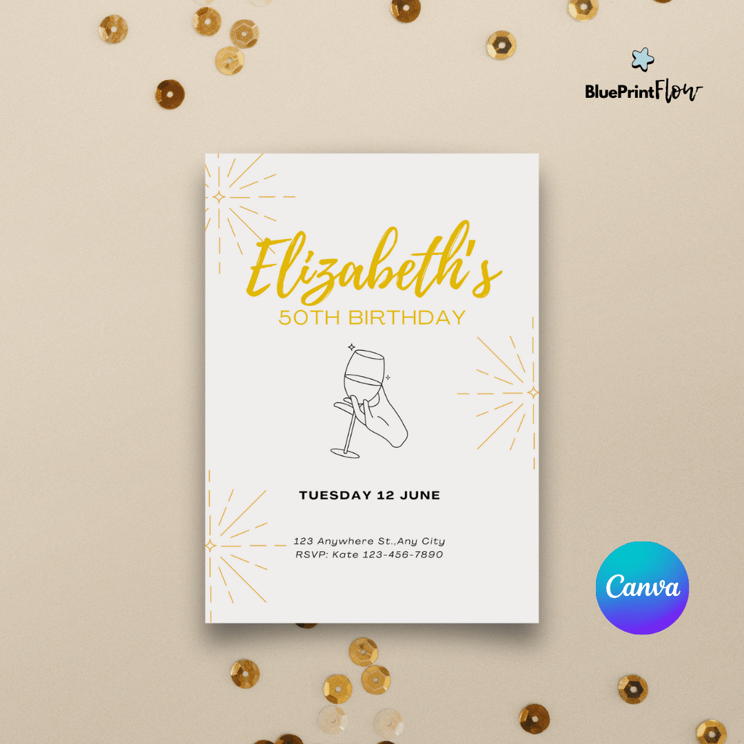 This free, simple, and elegant birthday party invitation template is perfect for your event! Featuring a sleek yellow accent, modern typography, and refined details, this design sets the tone for a sophisticated gathering. The template is fully editable in Canva, allowing you to customize every detail to suit your needs. Once done, easily download and print it at home or send it digitally.