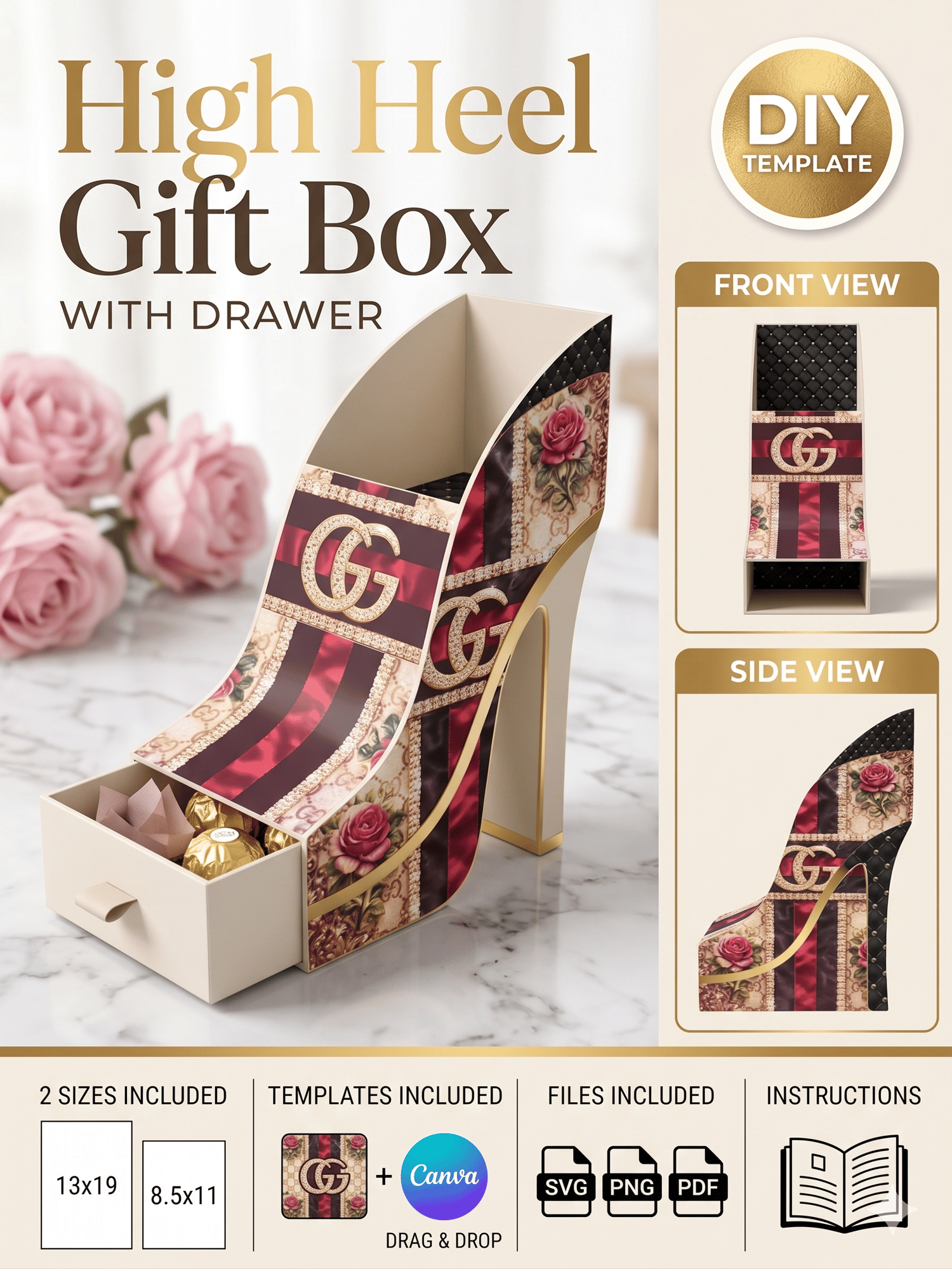 High Heel Gift Box Template Bundle | 13x19 & 8.5x11 SVG PNG PDF | Drawer Box + Drag & Drop Canva Template | Mother’s Day DIY Packaging