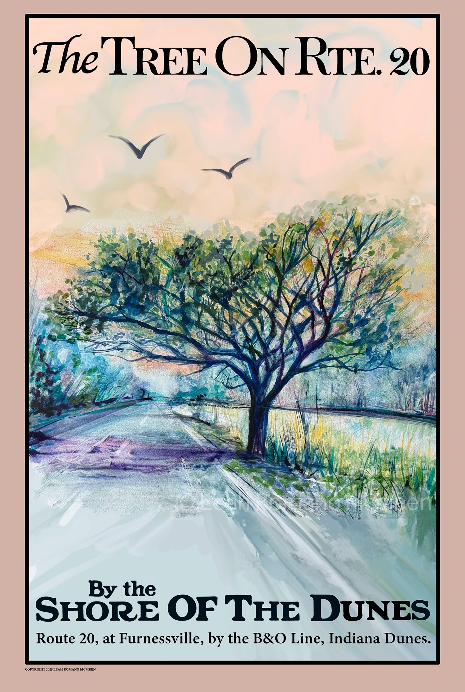 In the spirit of the South Shore Train Line posters, this is a watercolor and alcohol marker sketch of a famous tree in Furnessville, Indiana that stretched over Route 20 for many years.