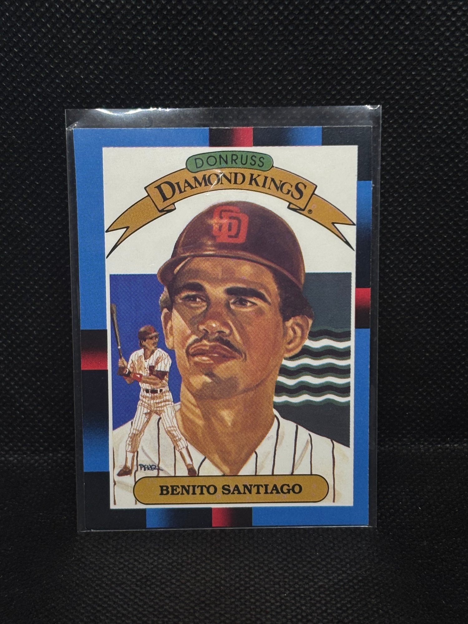 This classic 1988 Donruss Diamond Kings card features Benito Santiago, one of the most talented catchers to emerge from Puerto Rico and the 1987 NL Rookie of the Year. The “Diamond Kings” subset is known for its hand-painted artwork by Dick Perez, celebrating standout players from each MLB team.