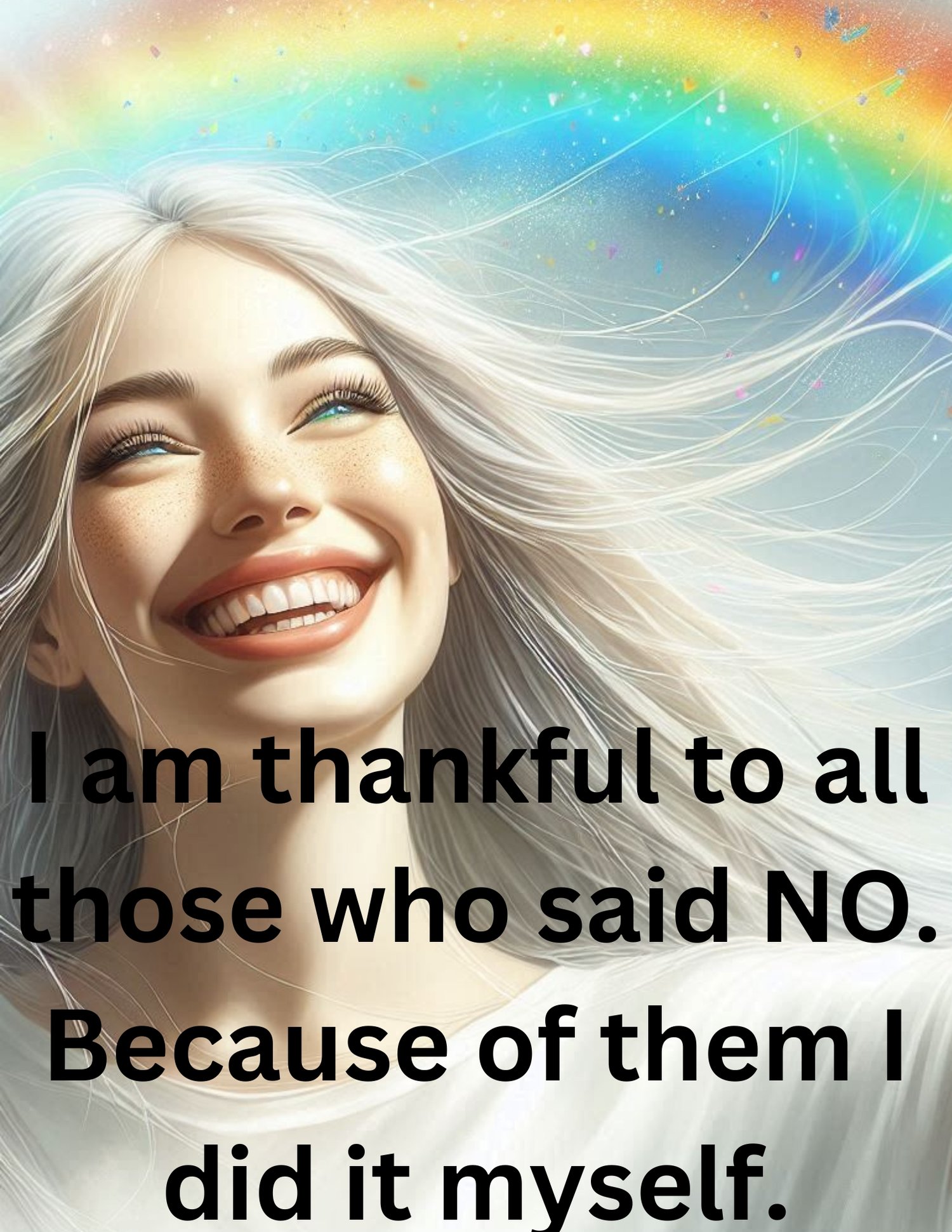 Inspirational quote for women reads, I am thankful to those who said NO. Because of them I did it myself. Download, print, frame in an 8 x 10 frame for less than $5.