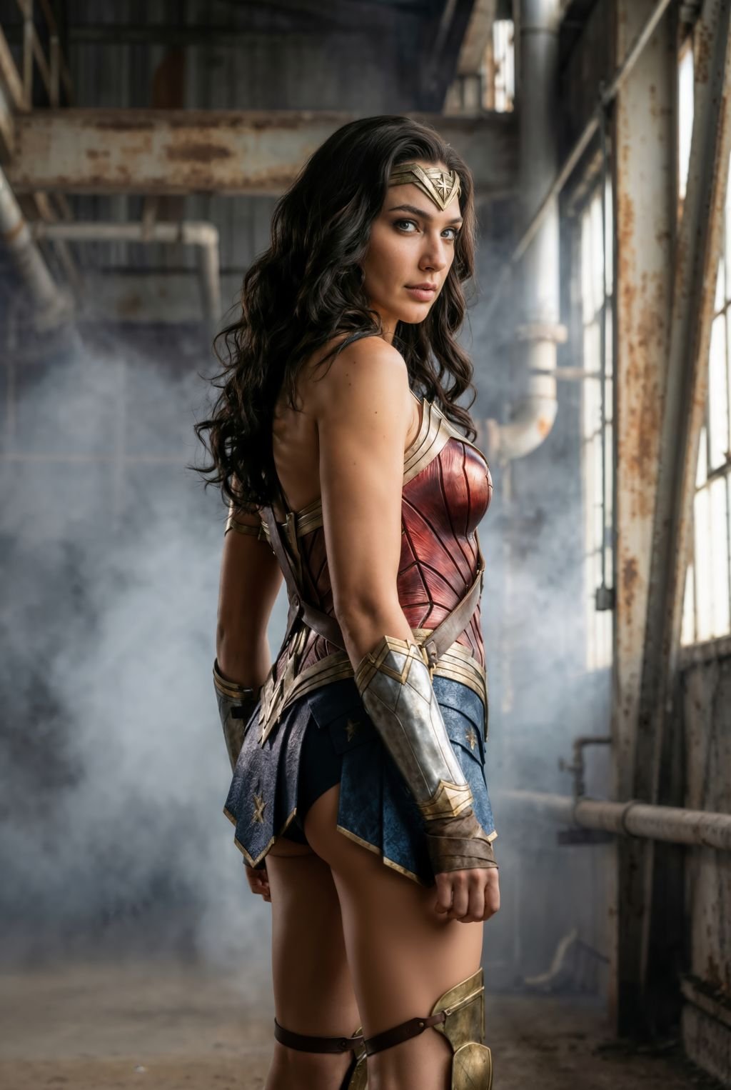 This 15K Wonder Woman–inspired artwork is pure cinematic presence: an industrial ruin washed in pale light, smoke curling through rusted beams, and Diana turning over her shoulder with that calm, commanding stare that stops everything. The armor catches the light like tempered gold, the blues and reds feel battle-ready, and the whole scene hums with tension—like the moment just before she decides how this ends.