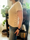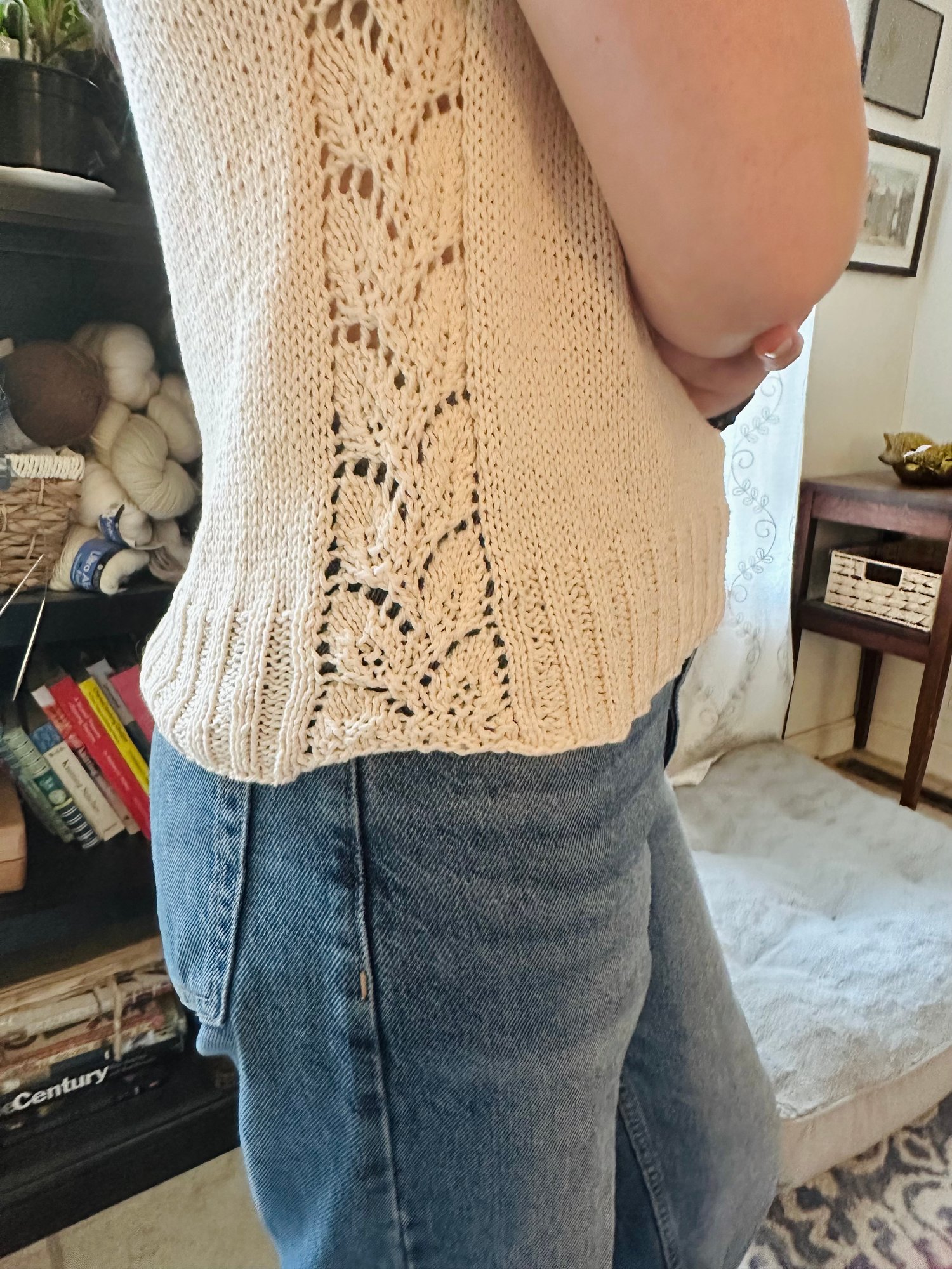 The Ballintober Tee is a DK-weight garment written in 9 sizes, with a stockinette yoke and lace panels running down the sides. The lace features interlocking leaves that grow from the underarm to the hem, flowing naturally into the ribbing for a clean, cohesive finish.