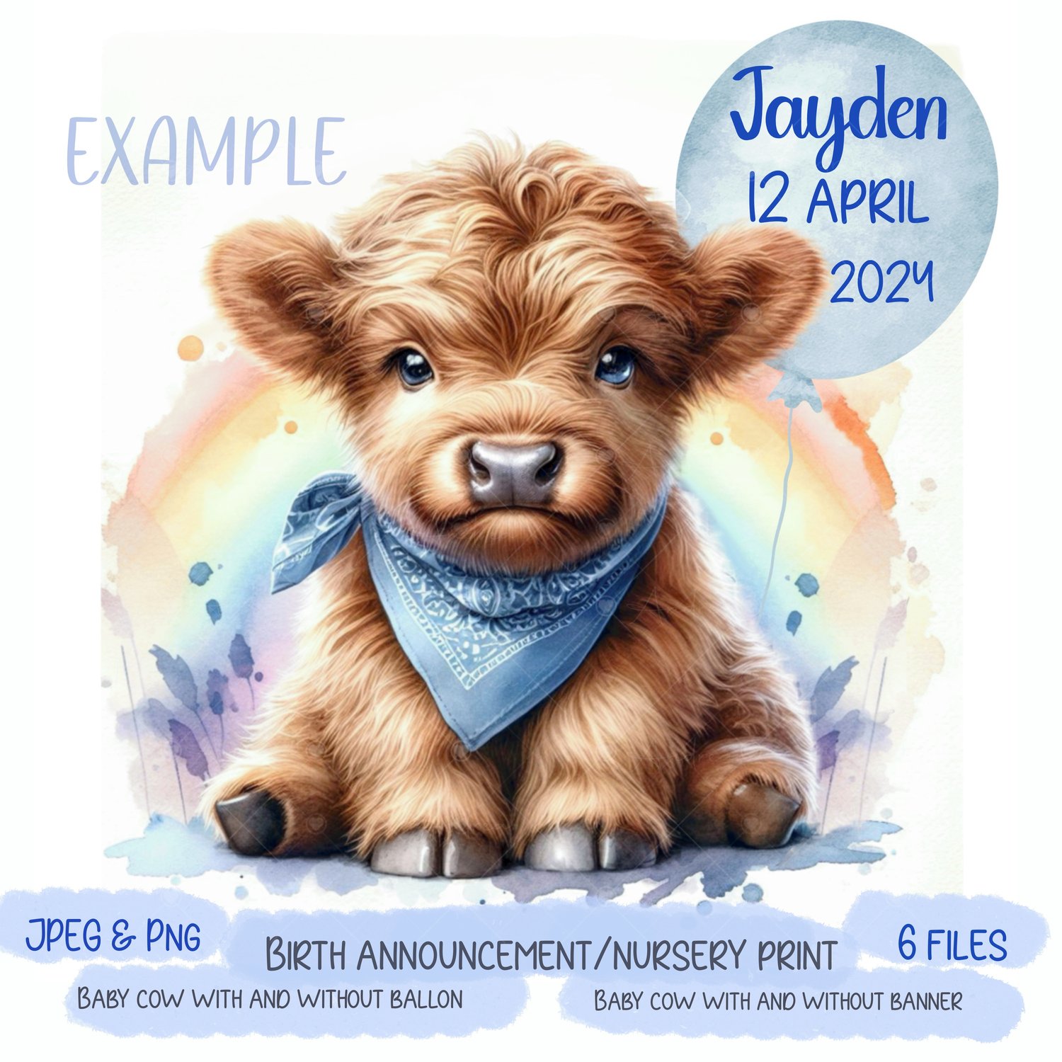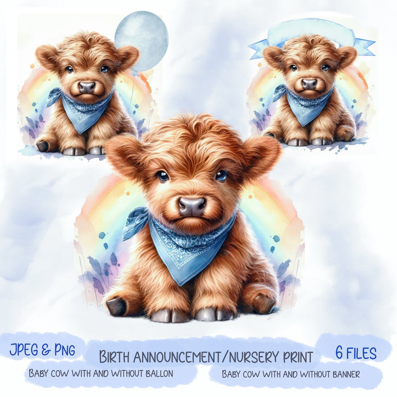 Beautiful newborn baby highland cow, birth announcement, nursery. 3 styles, balloon, banner, cow only. PNG & JPEG. Sublimation, print. Pink. Ideal for clothing, cups, prints, greetings cards, baby birth announcements, gender reveal etc. 6 files.