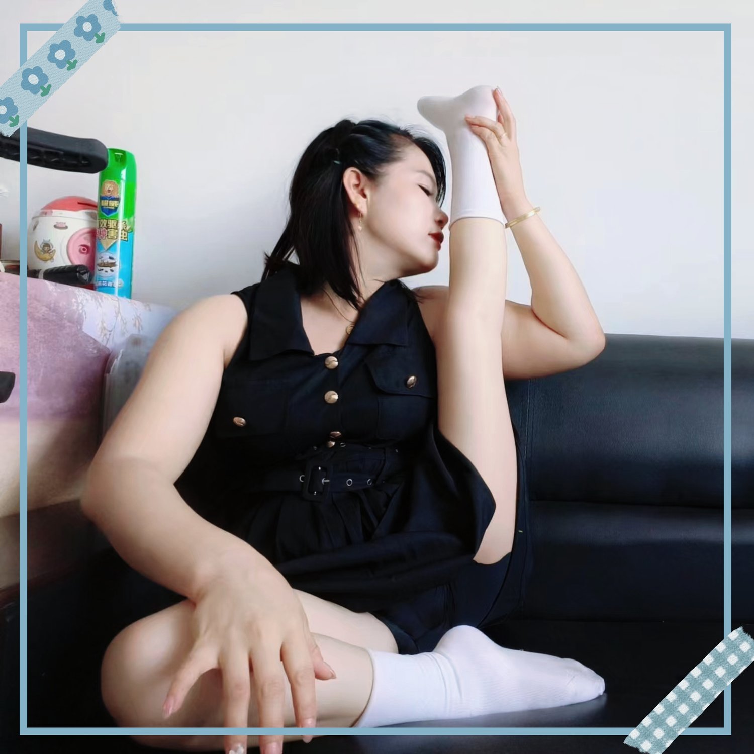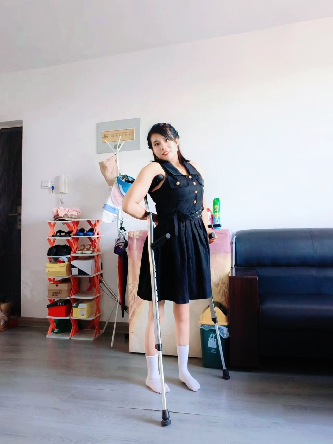 She slowly crawled out of the bedroom and got her crutches.
